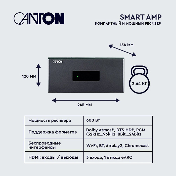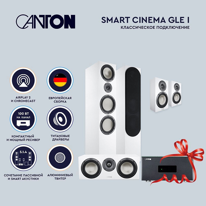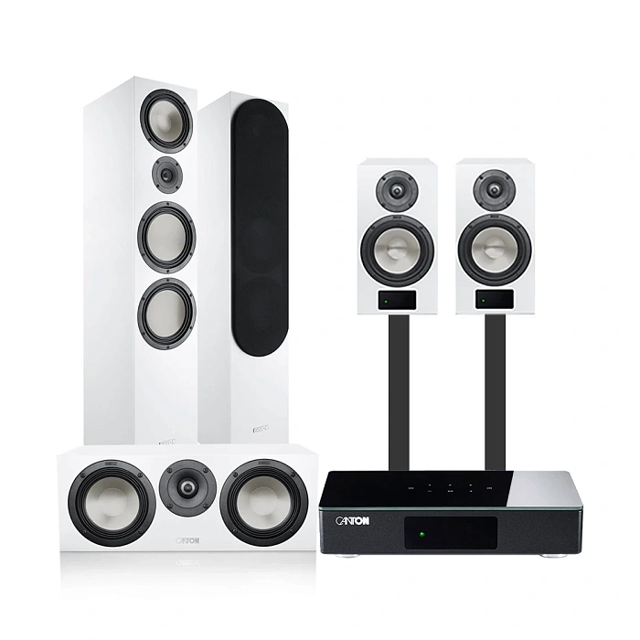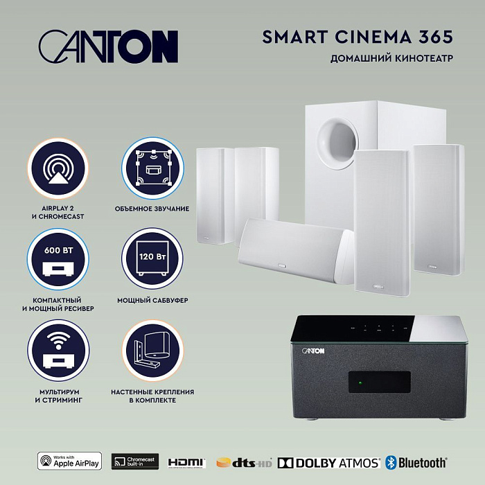 Комплект домашнего кинотеатра, цвет белый лак. Напольные АС: CD 290.3, white high gloss, АС центрального канала: CD 250.3, white high gloss, Полочные АС: CD 220.3, white high gloss, Ресивер Smart Amp 5.1 Мощность 600Вт.Wi-Fi, Bluetooth, HDMI, AirPlay 2, Chromecast, Spotify Connect, Dolby Atmos, DTS-HD.