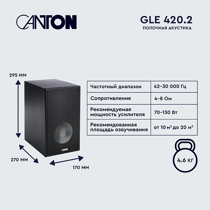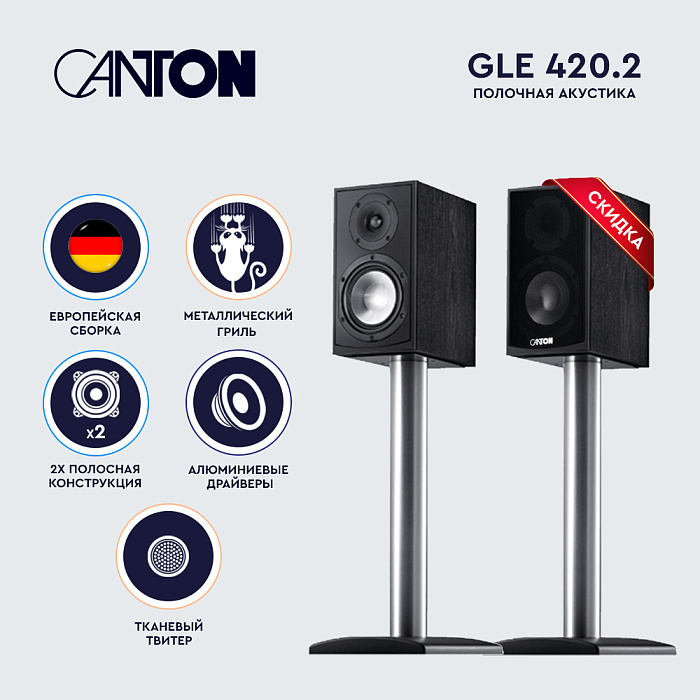 Canton GLE 20 S2 — самая компактная двухполосная полочная АС в серии GLE , мощность 70 Вт, чувствительность 86.5 дБ, импеданс 8 Ом, диапазон частот 42-30000 Гц