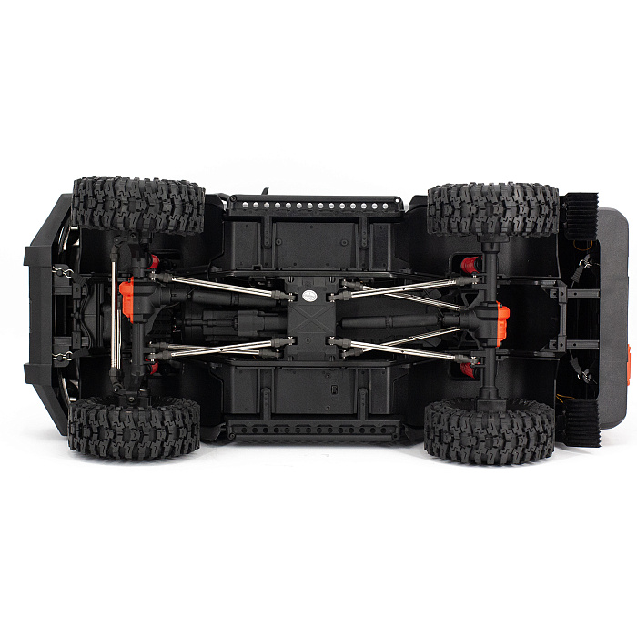 Модель имеет портальные мосты, двухскоростную коробку передач, 4WD, функцию блокировки задней оси и свободно переключаемый передний привод, режим разных скоростей между передним и задним приводом для восхождения. Pro Runner оснащен на заводе лебедкой с функцией разблокировки, задний мост в корпусе для поперечной устойчивости, светодиоды, 6-канальный передатчик, двигателем с очень плавным ходом.