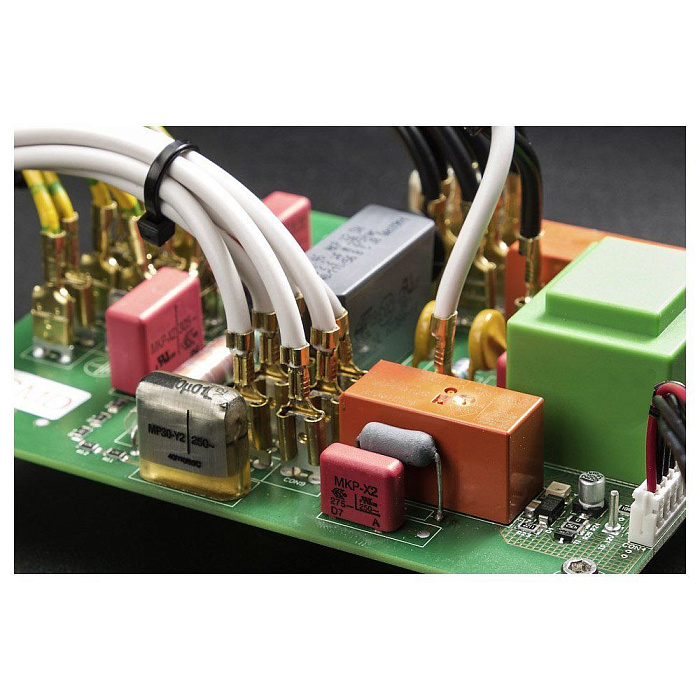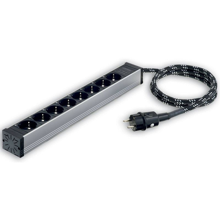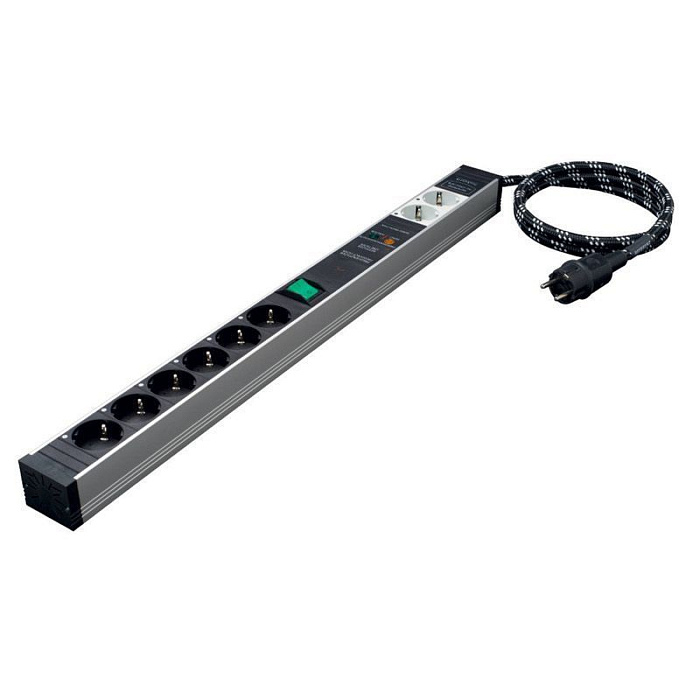 Сетевой фильтр с шестью независимыми зонами. Входной разъем IEC C20, защита от импульсных перенапряжений, саб-шасси для минимизации распространения паразитарных вибраций, полностью симметричная конструкция, разводка кабелем одинаковой длины по схеме "звезда". Отключение питания потребителей одной кнопкой.