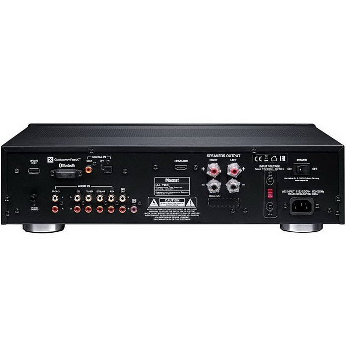 Интегральный усилитель, ЦАП, гибридная схема, выходная мощность: 2 x 200 Вт (4 Ом), 2 х 130 Вт (8 Ом), диапазон частот: 20 Гц - 20 кГц, гармоники: 1,0%, соотношение сигнал/шум: 105 дБ, ламповая комплектация: 2 x ECC 81 / 12AT7, встроенный фонокорректор: ММ/МС-тип, аудиовходы: 2 x S/PDIF (RCA), 2 x Toslink, 5 x RCA (Line), 2 x RCA (Phono), 1 x 3,5 мм, Bluetooth