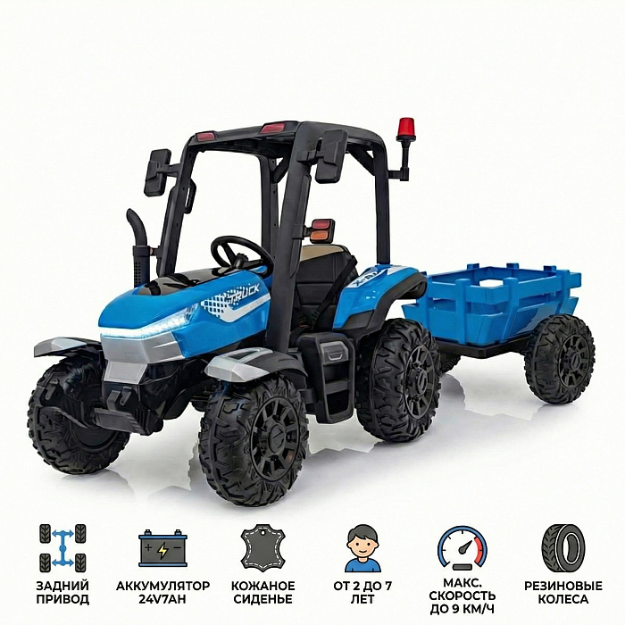 Детский электромобиль трактор с прицепом (синий, EVA, 4WD, пульт, 24V) - BLT-206C-4WD-24V-BLUE с крышей, большими мощными колеса и аккумулятором 24 вольта.