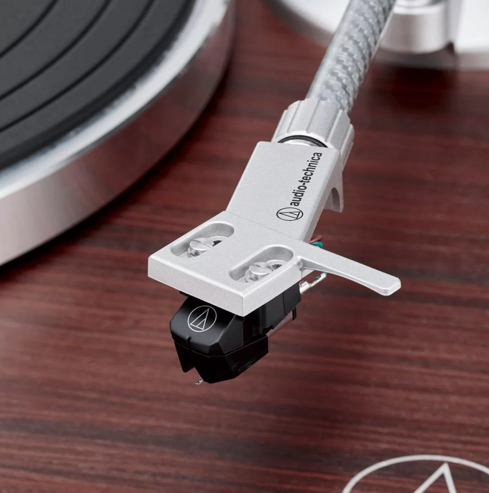 На Audio-Technica AT-LPW50BTRW установлен литой алюминиевый опорный диск, который комплектуется резиновым демпфирующим ковриком. В проигрывателе предусмотрено электронное переключение скорости пластинки 33 1/3 или 45 оборотов в минуту. Специальный сенсор в схеме стабилизации частоты вращения двигателя сохраняет ее требуемое значение с высокой точностью. Audio-Technica AT-LPW50BTRW оснащен прямым тонармом, трубка которого изготовлена из карбонового волокна. Шелл на тонарме съемный, и на него штатно установлен фирменный MM-звукосниматель AT-VM95E. Это одна из наиболее универсальных моделей компании, которая отлично подходит для прослушивания музыки различных жанров. Блок иглы в картридже съемный, благодаря чему обслуживание проигрывателя существенно упрощается.