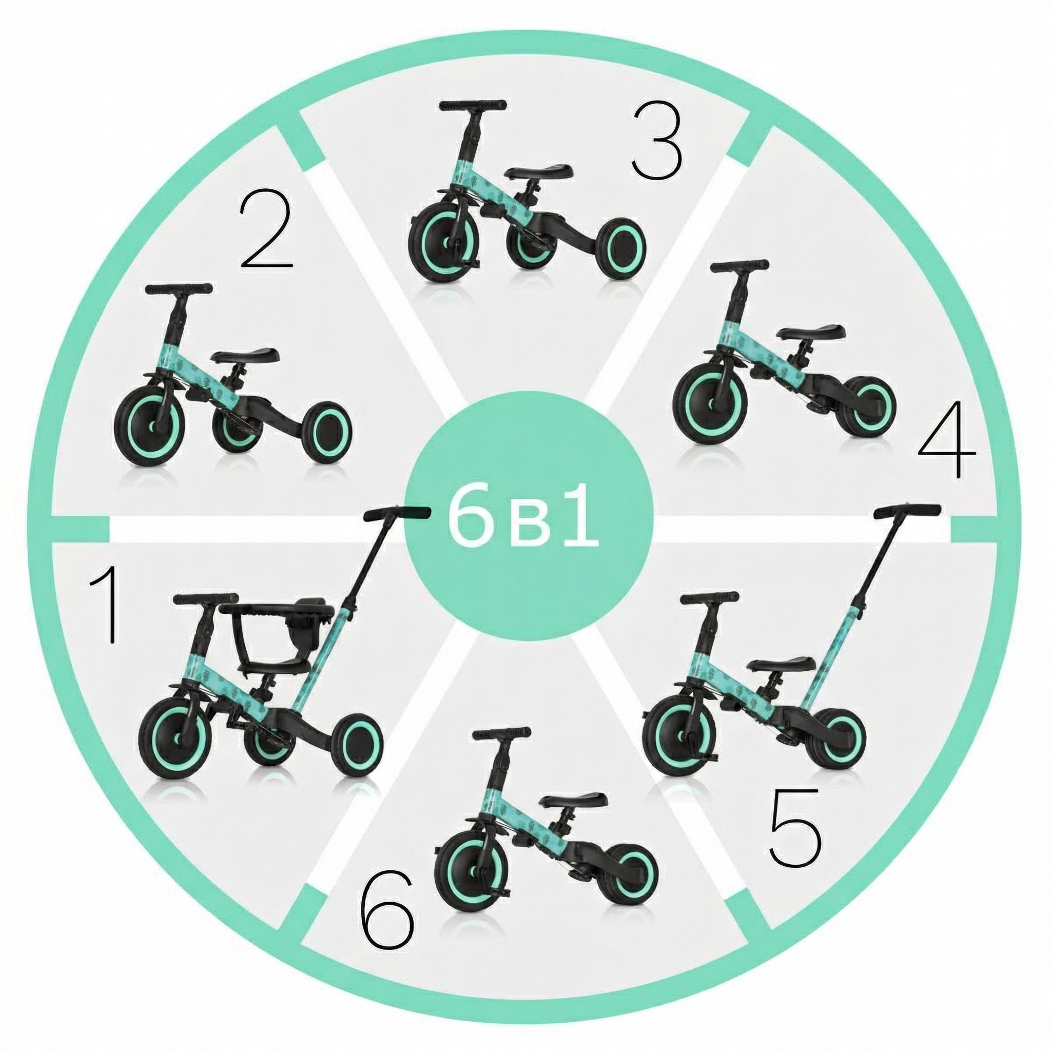 Детский беговел-велосипед 6в1 с родительской ручкой, зеленый с рисунком - TR008-CYAN-PAINT - это обновленная модель беговела TR007 с боковой поддержкой сиденья. TR008 - это удобный, универсальный и надежный беговел для детей от 1 до 5 лет, с возможностью становиться велосипедом!
