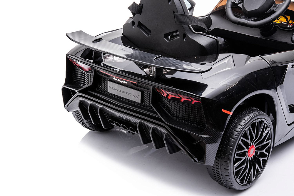 - Корпус электромобиля Lamborghini Aventador SV Roadster выполнен из высококачественного ударопрочного пластика с качественными ставками под карбон.