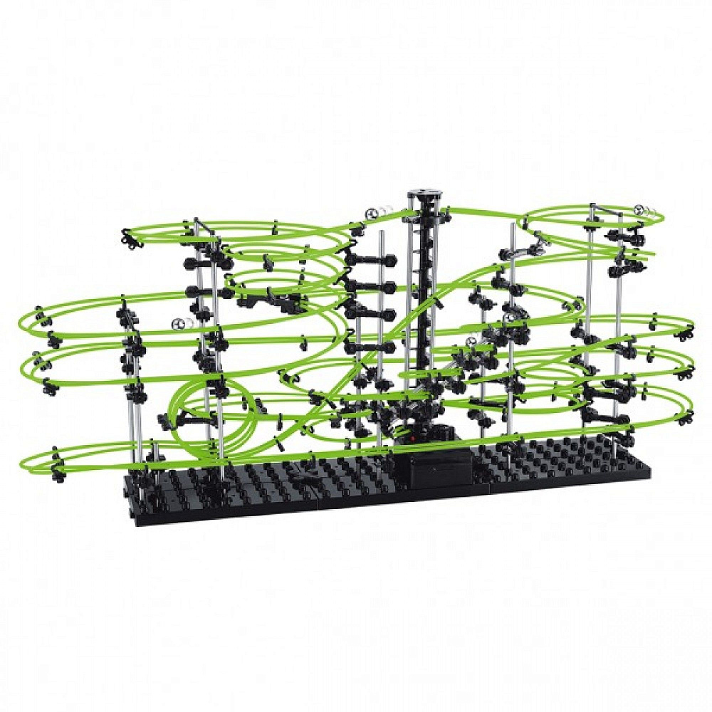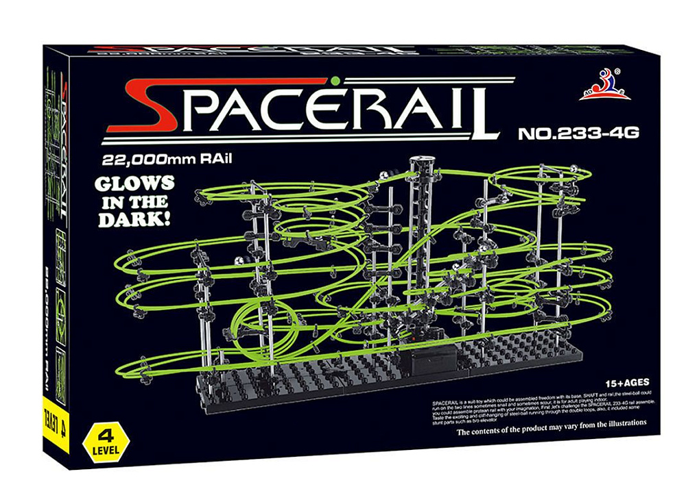 Динамический конструктор Космические горки, новая серия, светящиеся рельсы, уровень 4 - 233-4G - это конструктор SpaceRail 4 уровня у которого рельсы светятся в темноте и это позволяет наблюдать за перемещением металлических шариков по рельсам конструктора протяженностью 22 метра.