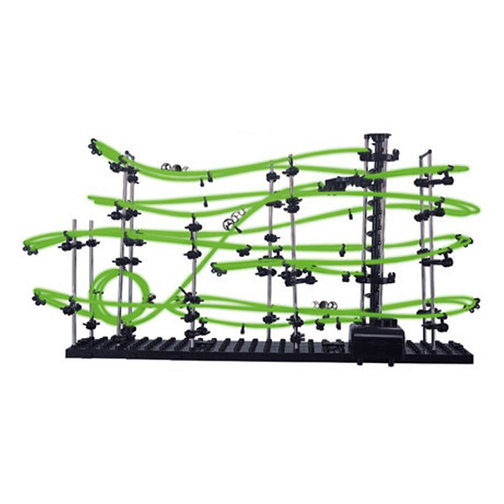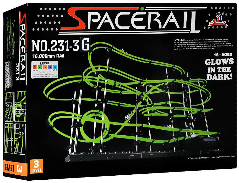 Динамический конструктор Космические горки, светящиеся рельсы, уровень 3 - 231-3G - это конструктор SpaceRail 3 уровня у которого рельсы светятся в темноте и это позволяет наблюдать за перемещением металлических шариков по рельсам конструктора протяженностью 16 метров.