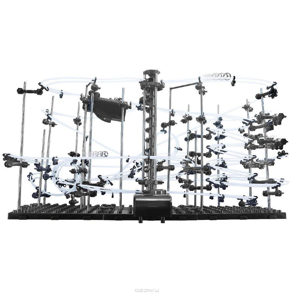 В чем смысл? Из идущих в комплекте запчастей нужно собрать хитрую конструкцию, по которой будут носится металлические шарики. Количество запчастей, шариков, длина рельс, сложность отдельных элементов зависит от уровня конструктора. Вы можете собрать конструкцию по инструкции, либо придумать свою, ограничений только два - это ваша фантазия и количество запчастей. Наборы полностью совместимы, имея в наличии разные уровни можно их объединить и собрать что-нибудь очень большое.