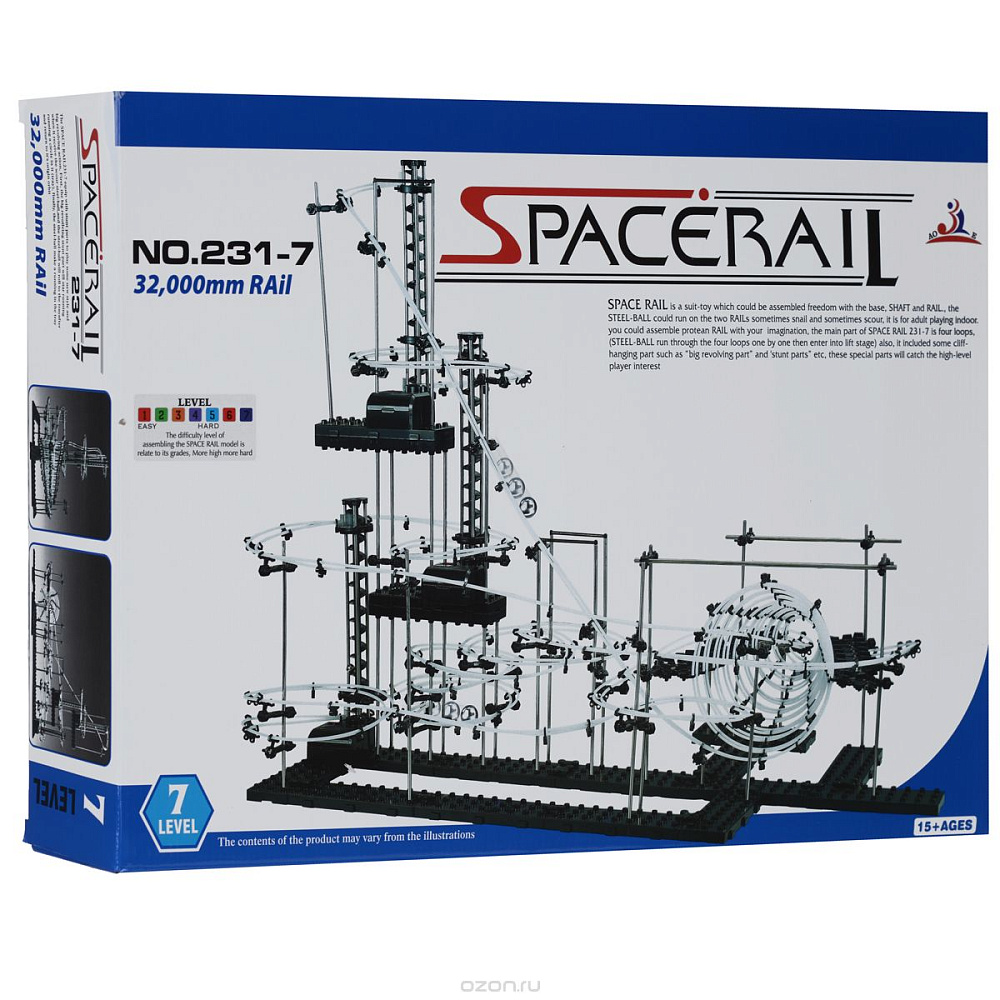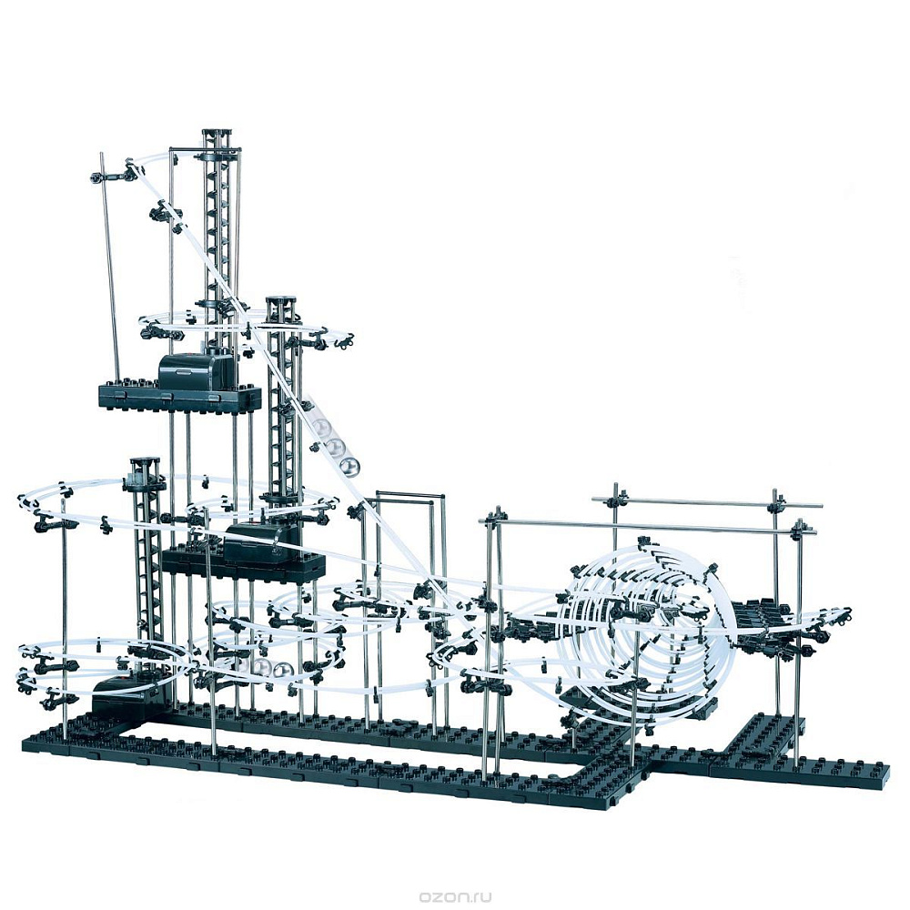 В чем смысл? Из идущих в комплекте запчастей нужно собрать хитрую конструкцию, по которой будут носится металлические шарики. Количество запчастей, шариков, длина рельс, сложность отдельных элементов зависит от уровня конструктора. Вы можете собрать конструкцию по инструкции, либо придумать свою, ограничений только два - это ваша фантазия и количество запчастей. Наборы полностью совместимы, имея в наличии разные уровни можно их объединить и собрать что-нибудь очень большое.
