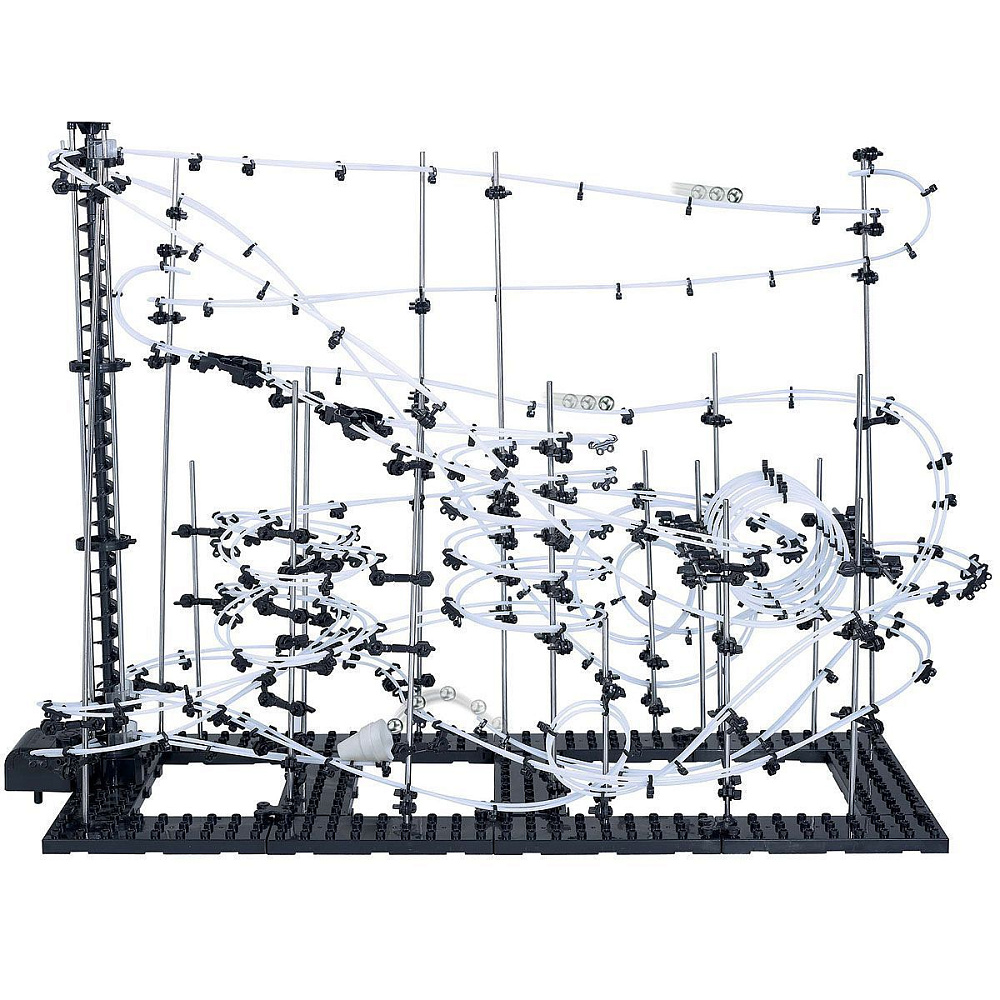 В чем смысл? Из идущих в комплекте запчастей нужно собрать хитрую конструкцию, по которой будут носится металлические шарики. Количество запчастей, шариков, длина рельс, сложность отдельных элементов зависит от уровня конструктора.