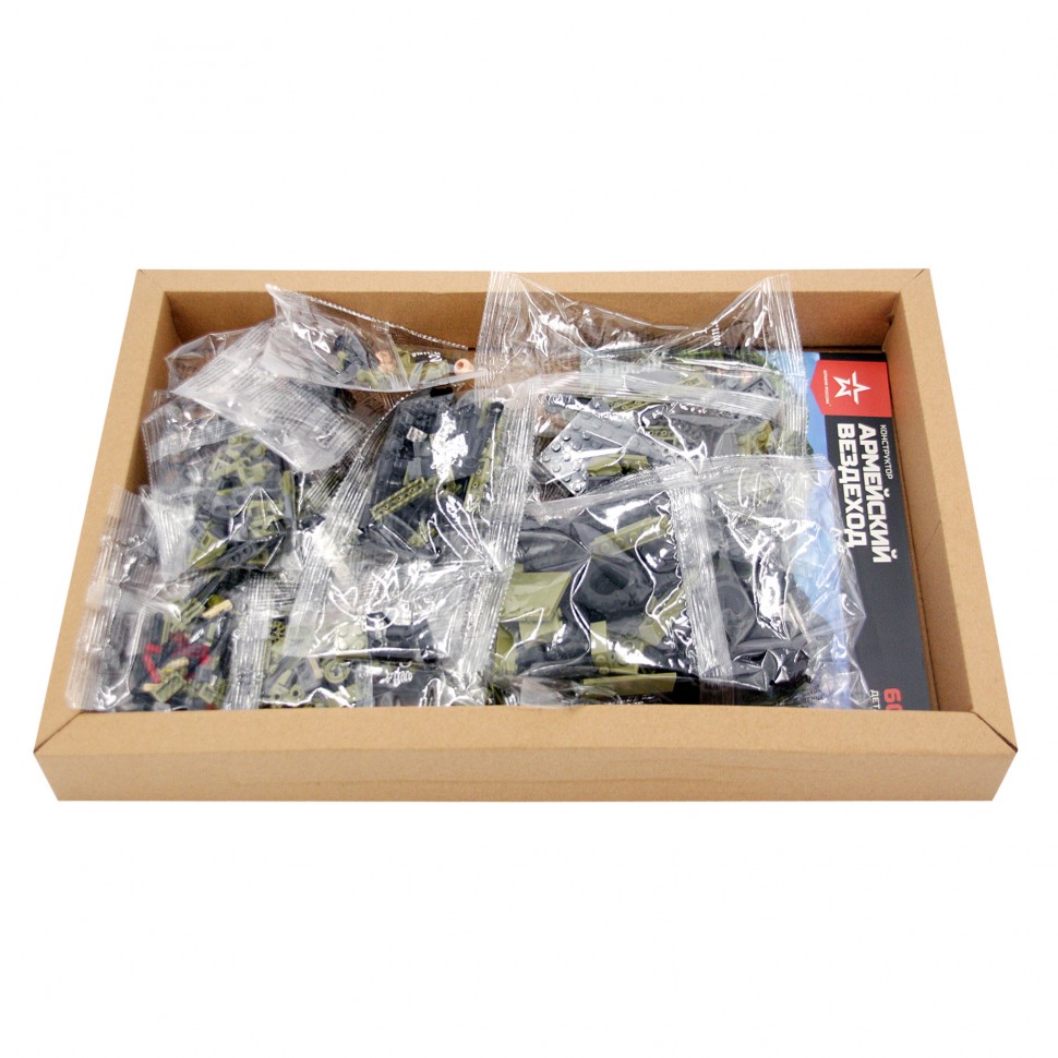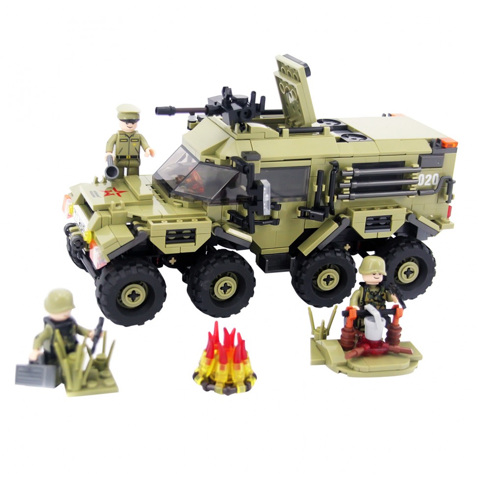 В составе набора мини сюжеты: два костра и 3 солдатика с большим комплектом вооружения и снаряжения для них. Повернув определенным образом колеса, вездеход может двигаться по кругу. Модель характеризует высокая детализация и точность подбора комплектующих. Набор снабжен инструкцией которая легко позволит собрать данную модель. Детали конструктора упакованы в пакетики.