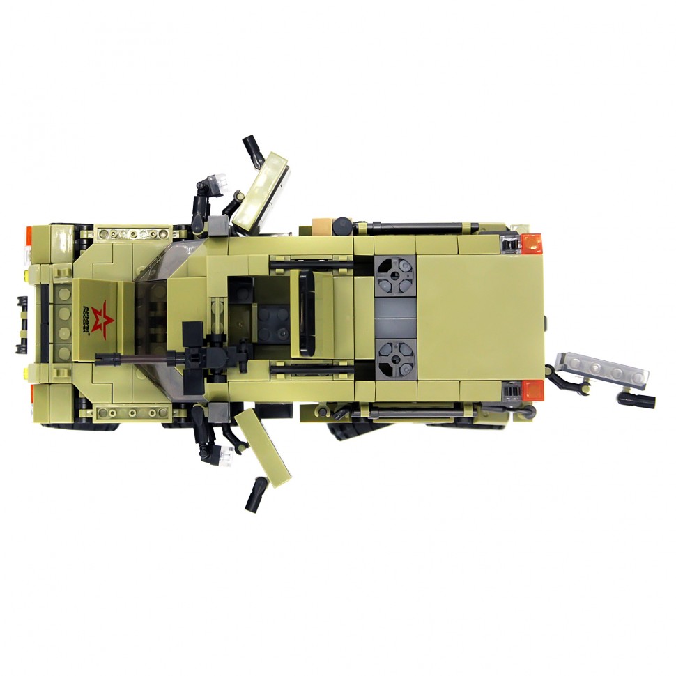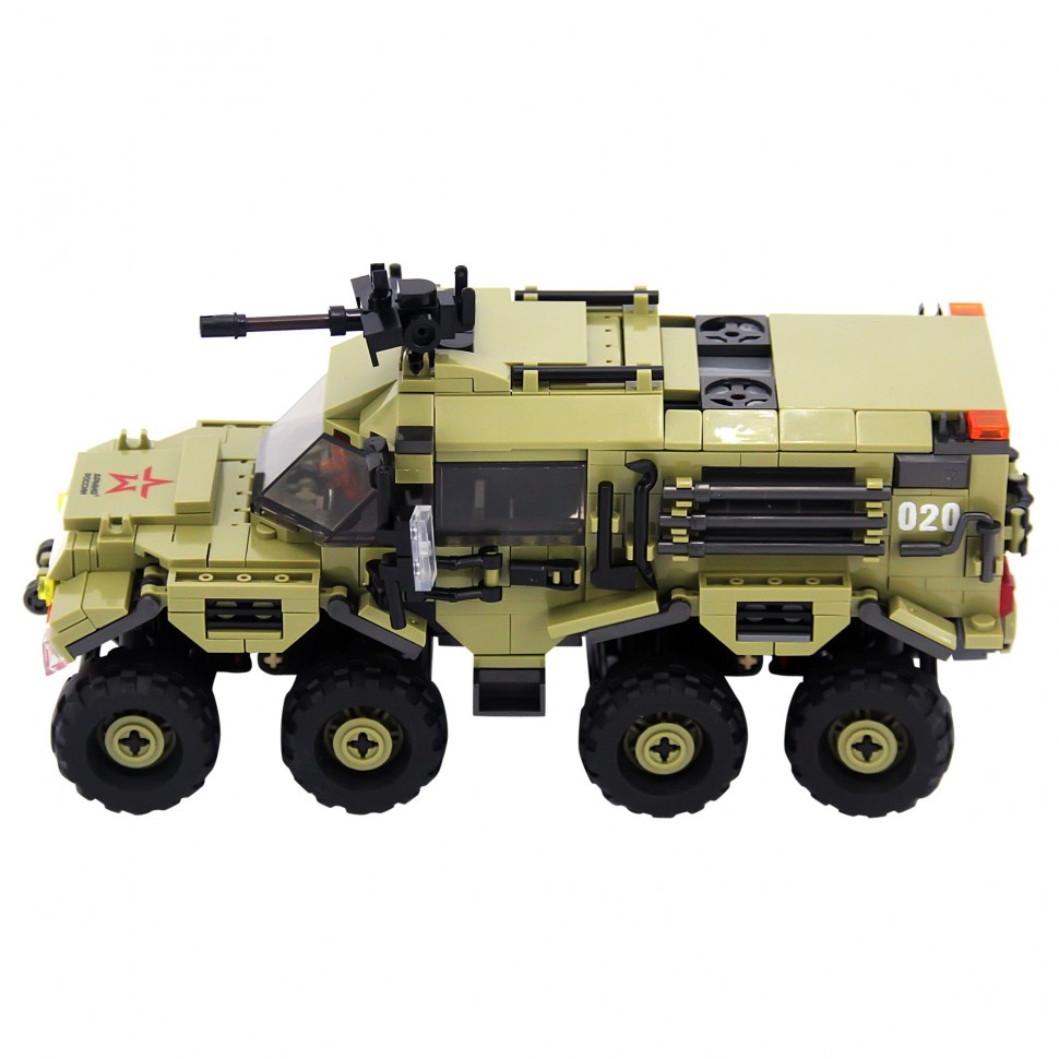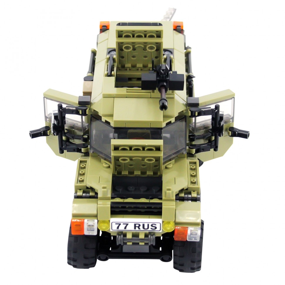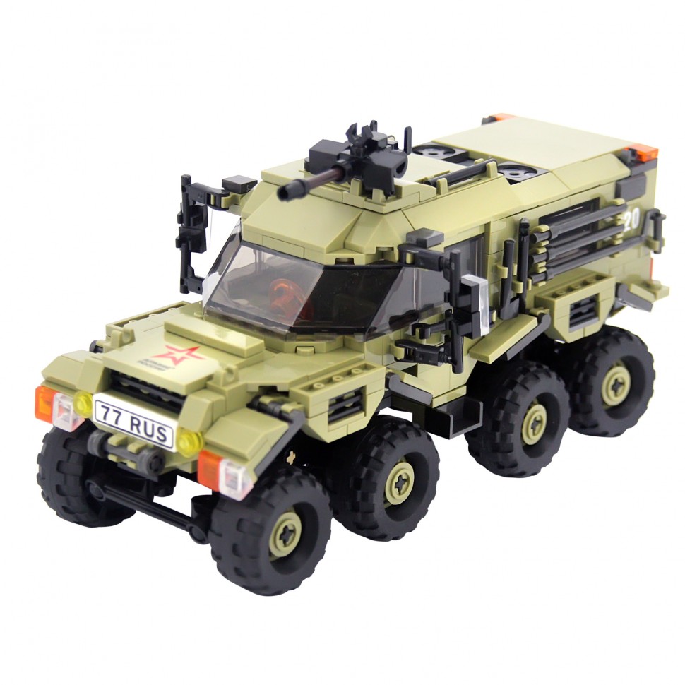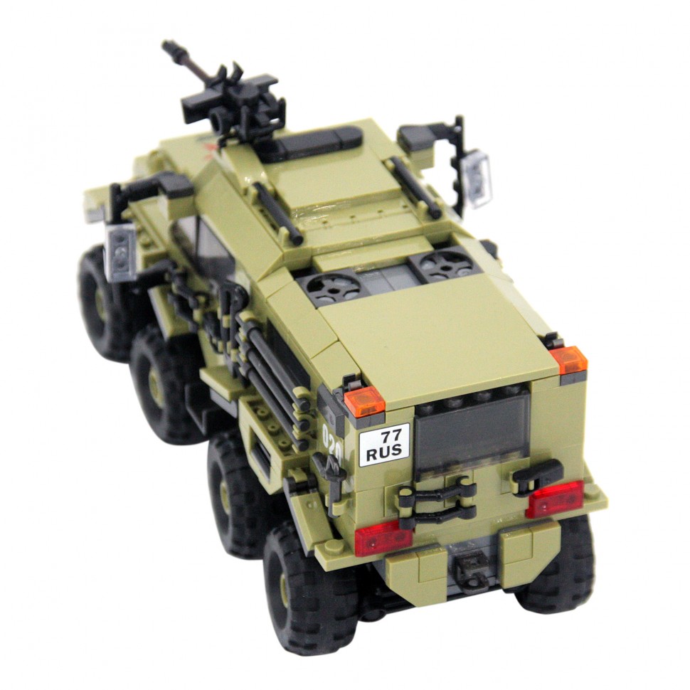 Конструктор напоминает российский вездеход ''ШАМАН''. У модели открываются двери кабины и задняя дверь, капот, люк на крыше, вращается пулемет, есть фаркоп, все колеса ''управляемые'' и амортизируемые, в кабину и кузов можно поместить солдатиков. Цвет и маркировка техники, форма и символика мини фигурок/солдатиков, максимально приближены к используемым в Российской Армии.