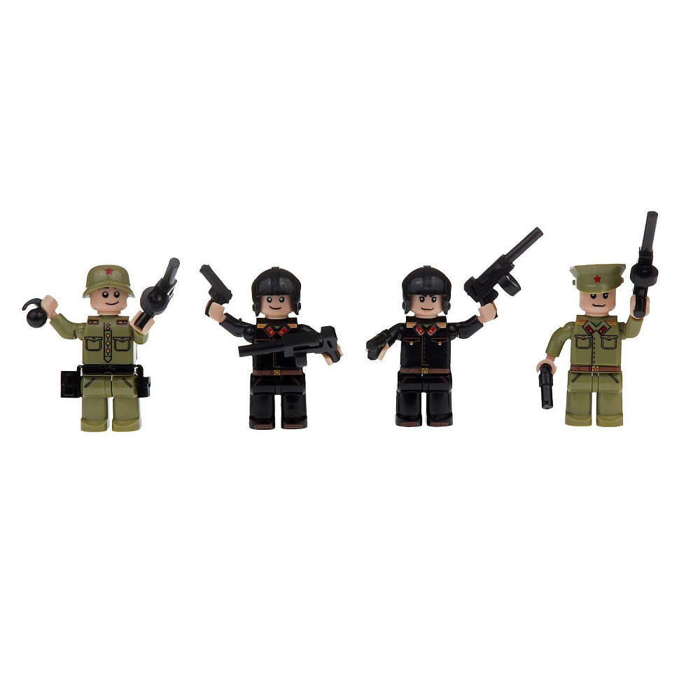 • В комплекте 4 мини фигурки. Это два танкиста, пехотинец в каске и командир, форма которых максимально приближена к оригинальной форме бойцов и танкистов Красной армии 1943-1945 гг.