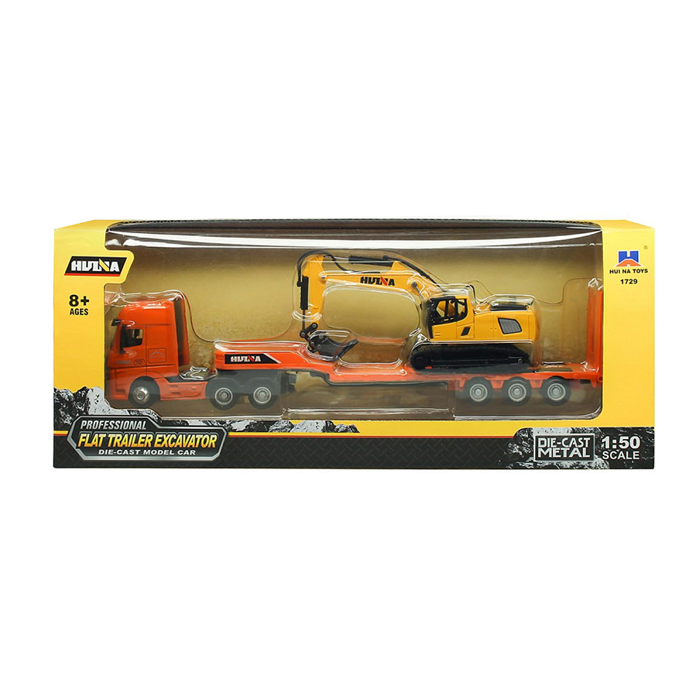 Металлический грузовик трейлер с экскаватором HUINA 1:50 - HN1729-ORANGE - это набор в состав которого входит металлическая модель трейлера и экскаватора с ковшом, которая станет отличным дополнением в коллекцию уменьшенных копий спецтехники, как юного, так и взрослого автолюбителя. Модели выполнены в масштабе 1:50 с высокой точностью передачи оригинальных пропорций и особенностей дизайна. Цветовая гамма контрастных цветов привлекает к себе внимание. Через прозрачные окошки можно разглядеть кабину водителя, а вращающиеся части добавят интерактивности в игру. Приобретая другую технику этой линейки, можно собрать целую стройку!