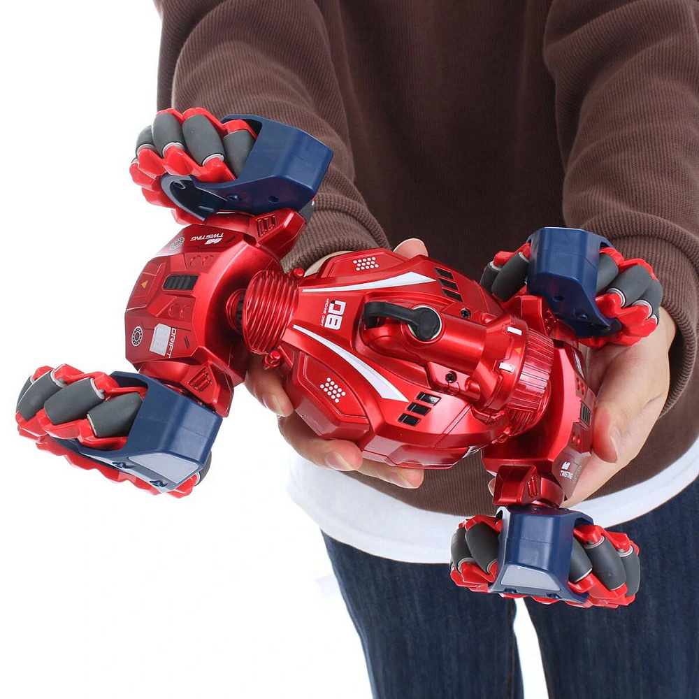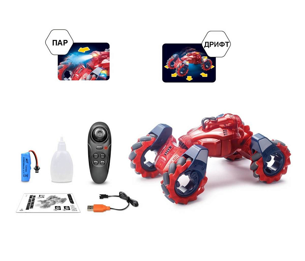 Радиоуправляемая машина (гиропульт, пар) 1:12 - RWG123 - это машинка перевертыш дрифт Твистер, которая является несомненным хитом продаж среди радиоуправляемых моделей. Обновленная версия стала еще лучше. О такой машинке мечтает каждый мальчик. Возможности машинки просто невероятны. Она может ездить, крутиться на месте, и даже пускать пар! Но главная особенность заключается в управлении и уникальных колесах с яркой светодиодной подсветкой. Данной машинкой можно управлять при помощи специального пульта, который входит в комплект с машинкой. Увлекательный процесс управления понравится не только детям, но и взрослым. И все это будет сопровождаться звуками работающего мотора, яркой подсветкой колес, паром и песнями. Особенно эффектно машинка смотрится в темноте.