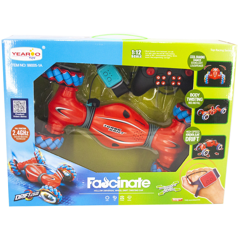 Радиоуправляемый дрифт Твистер Yearoo (часы + пульт) 1:14 - 99005-1A-RED - это машинка перевертыш Drift King, которая является несомненным хитом продаж среди радиоуправляемых моделей. Обновленная версия стала еще лучше. О такой машинке мечтает каждый мальчик. Возможности машинки Drift King просто невероятны. Она может ездить, крутиться на месте, переворачиваться и ехать дальше, приподниматься и даже танцевать. Но главная особенность заключается в управлении и уникальных колесах с яркой светодиодной подсветкой. Данной машинкой можно управлять жестами при помощи специального браслета, который входит в комплект с машинкой Drift King. Увлекательный процесс управления понравится не только детям, но и взрослым. И все это будет сопровождаться звуками работающего мотора, яркой подсветкой колес и песнями. Особенно эффектно машинка смотрится в темноте.