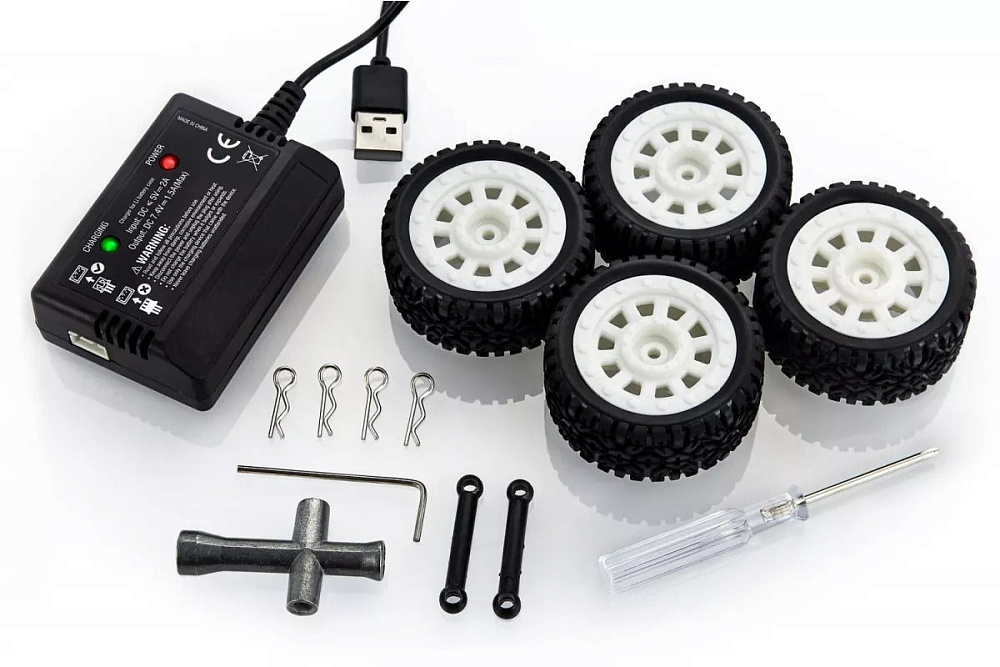 - Входит в комплект Машинка, пульт управления, аккумулятор 7,4 В 1200 мАч, зарядное устройство, 8 колес в комплекте ( 4 шосейные, 4 дрифтовые) отвертка, инструкция.