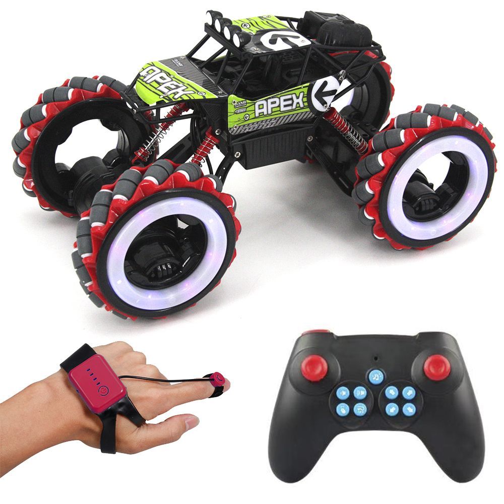 - Контроль жестами: в комплект входит дополнительный пульт, который фиксируются на ладони. Благодаря ему вы сможете управлять вездеходом лёгкими жестами одной руки. При этом вы сможете управлять не только направлением движения, но и изменять высоту подвески машины и делать трюки.