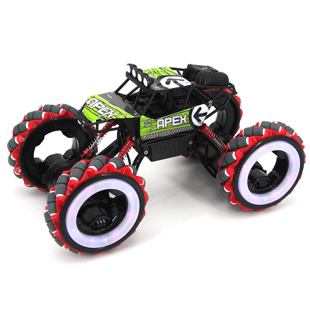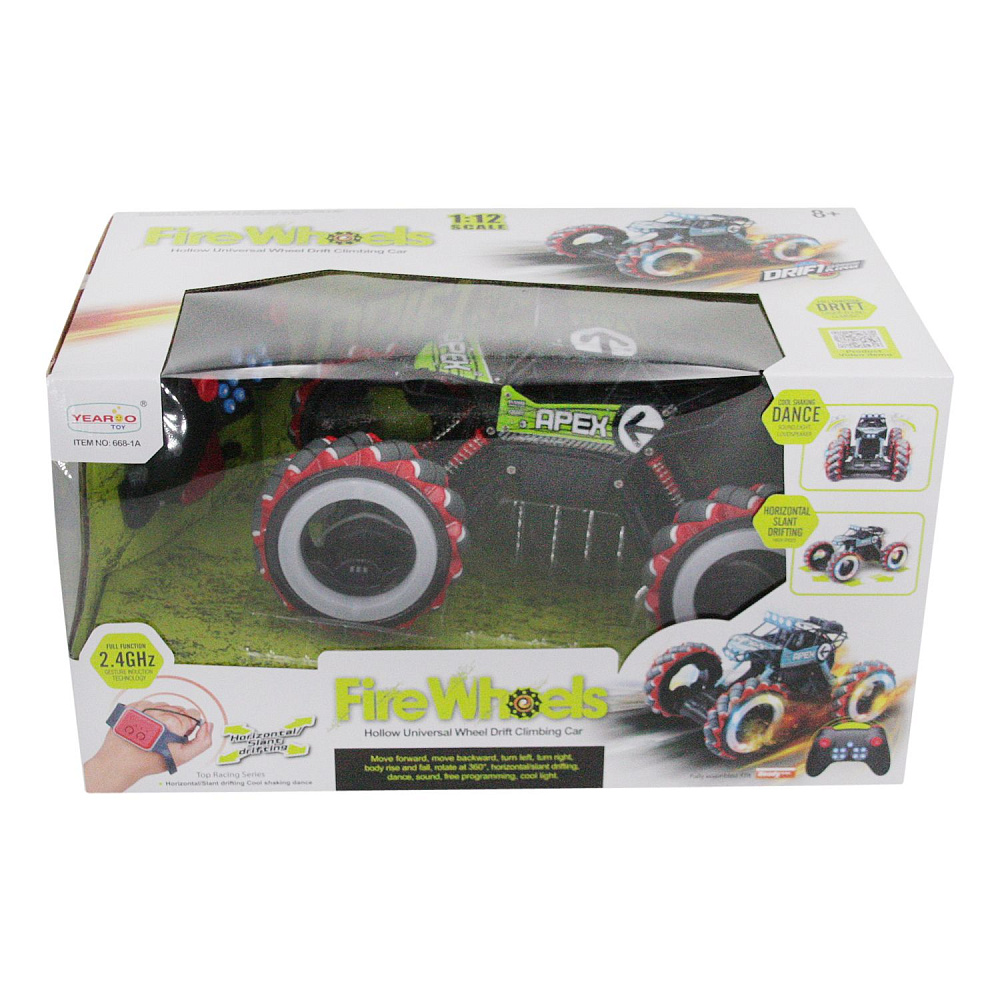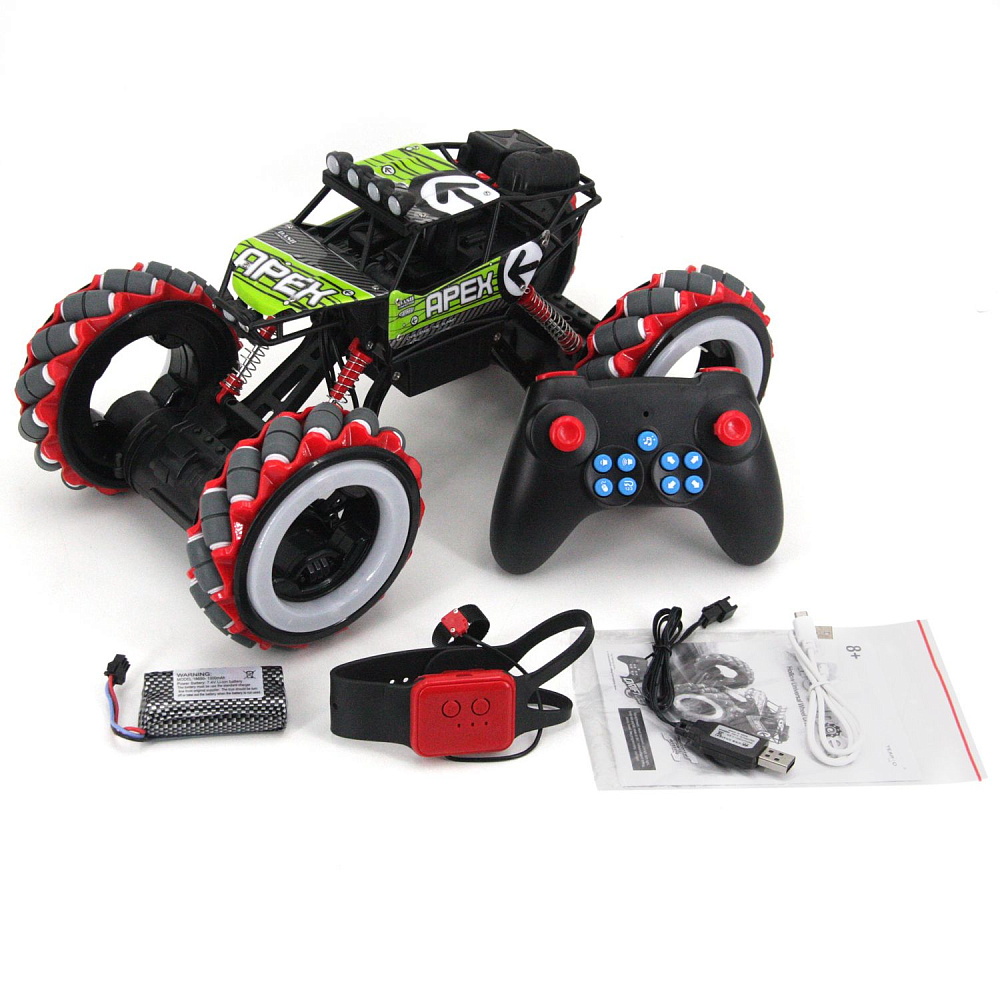 Радиоуправляемый джип для дрифта Yearoo (часы + пульт) 1:12 - 668-1A-GREEN - это машинка краулер Apex Fire Wheels, которая является несомненным хитом продаж среди радиоуправляемых моделей. О такой машинке мечтает каждый мальчик. Возможности машинки Apex Fire Wheels просто невероятны. Она может ездить, крутиться на месте и ехать дальше, приподниматься и даже танцевать. Но главная особенность заключается в управлении и уникальных колесах с яркой светодиодной подсветкой. Данной машинкой можно управлять жестами при помощи специального браслета, который входит в комплект с машинкой Apex Fire Wheels. Увлекательный процесс управления понравится не только детям, но и взрослым. И все это будет сопровождаться звуками работающего мотора, яркой подсветкой колес и песнями. Особенно эффектно машинка смотрится в темноте.