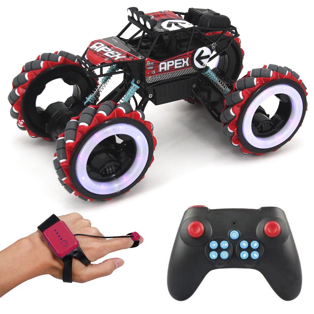 - Контроль жестами: в комплект входит дополнительный пульт, который фиксируются на ладони. Благодаря ему вы сможете управлять вездеходом лёгкими жестами одной руки. При этом вы сможете управлять не только направлением движения, но и изменять высоту подвески машины и делать трюки.