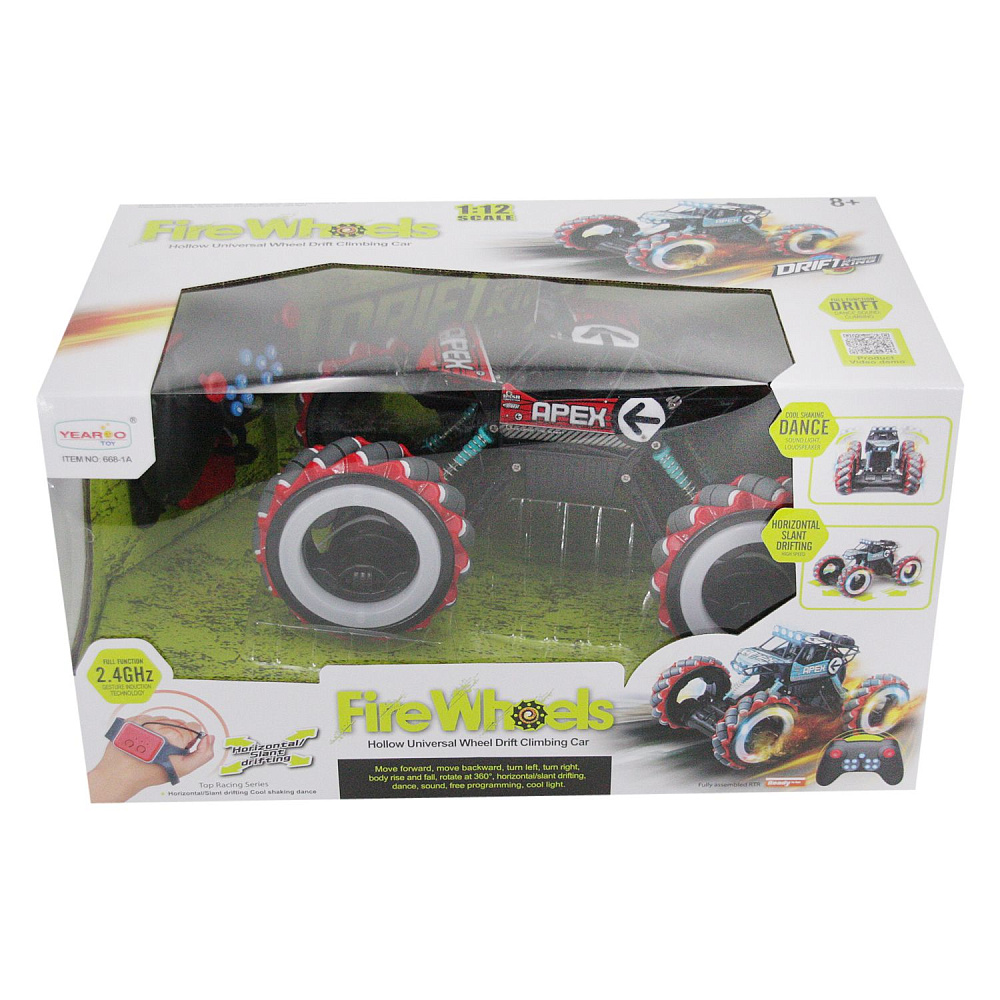 Радиоуправляемый джип для дрифта Yearoo (часы + пульт) 1:12 - 668-1A-RED - это машинка краулер Apex Fire Wheels, которая является несомненным хитом продаж среди радиоуправляемых моделей. О такой машинке мечтает каждый мальчик. Возможности машинки Apex Fire Wheels просто невероятны. Она может ездить, крутиться на месте и ехать дальше, приподниматься и даже танцевать. Но главная особенность заключается в управлении и уникальных колесах с яркой светодиодной подсветкой. Данной машинкой можно управлять жестами при помощи специального браслета, который входит в комплект с машинкой Apex Fire Wheels. Увлекательный процесс управления понравится не только детям, но и взрослым. И все это будет сопровождаться звуками работающего мотора, яркой подсветкой колес и песнями. Особенно эффектно машинка смотрится в темноте.
