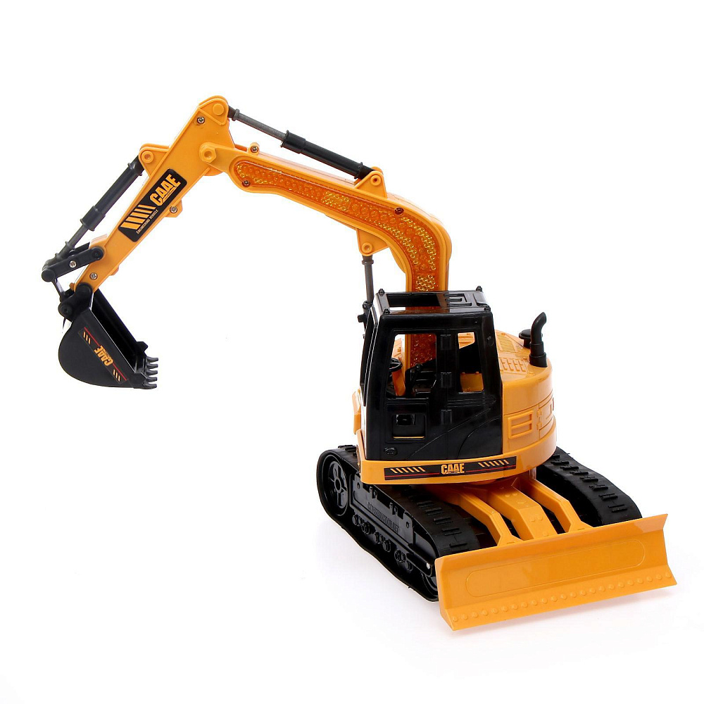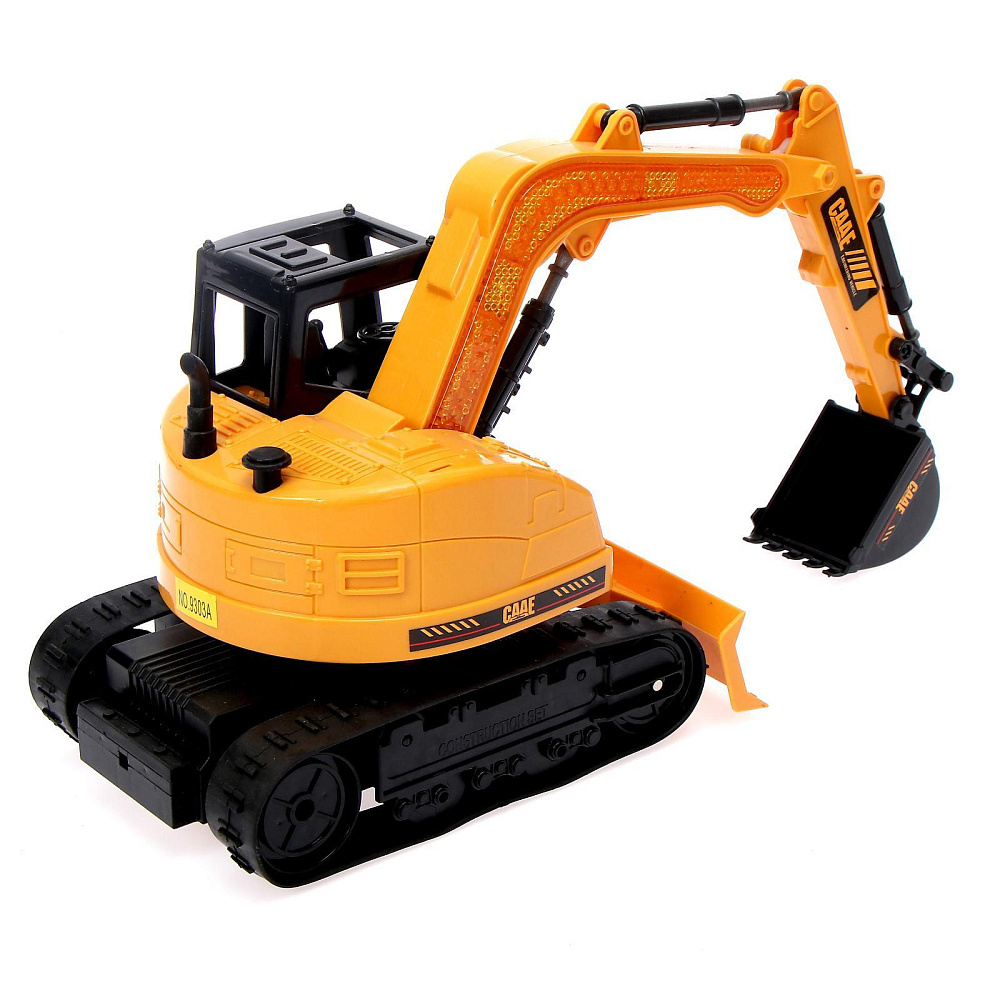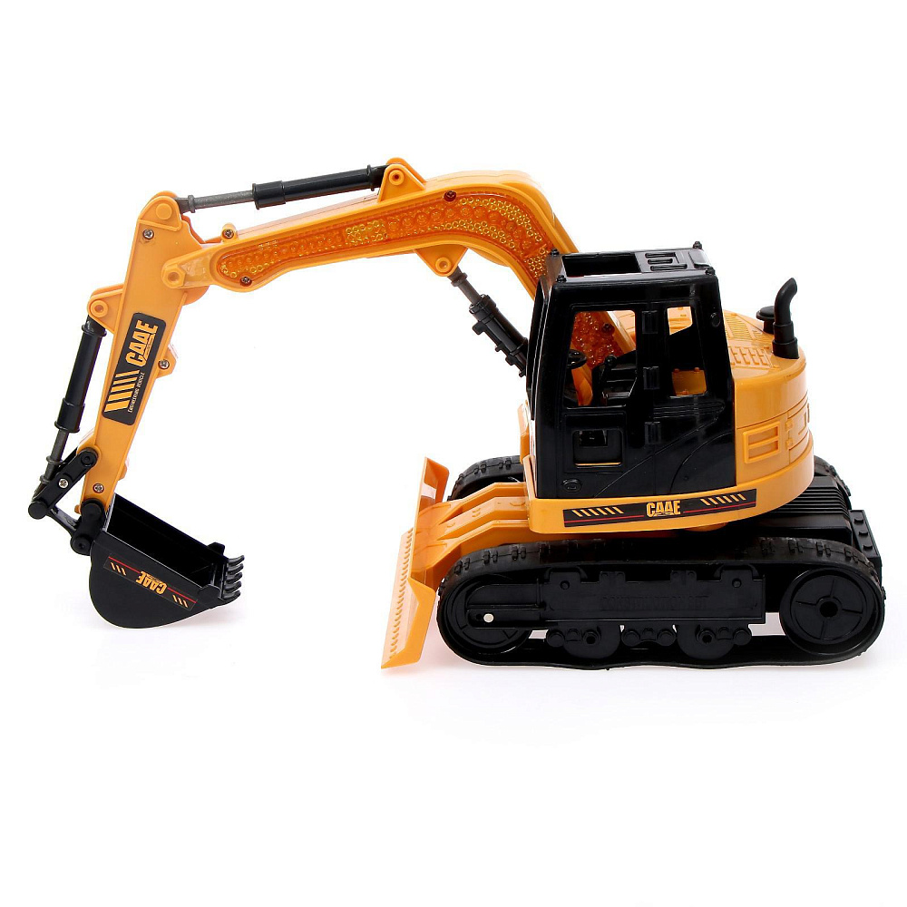 Работает экскаватор от 4 батареек типа АА. Пульт ДУ работает от встроенного аккумулятора. С таким набором можно легко организовать самую сложную стройку.