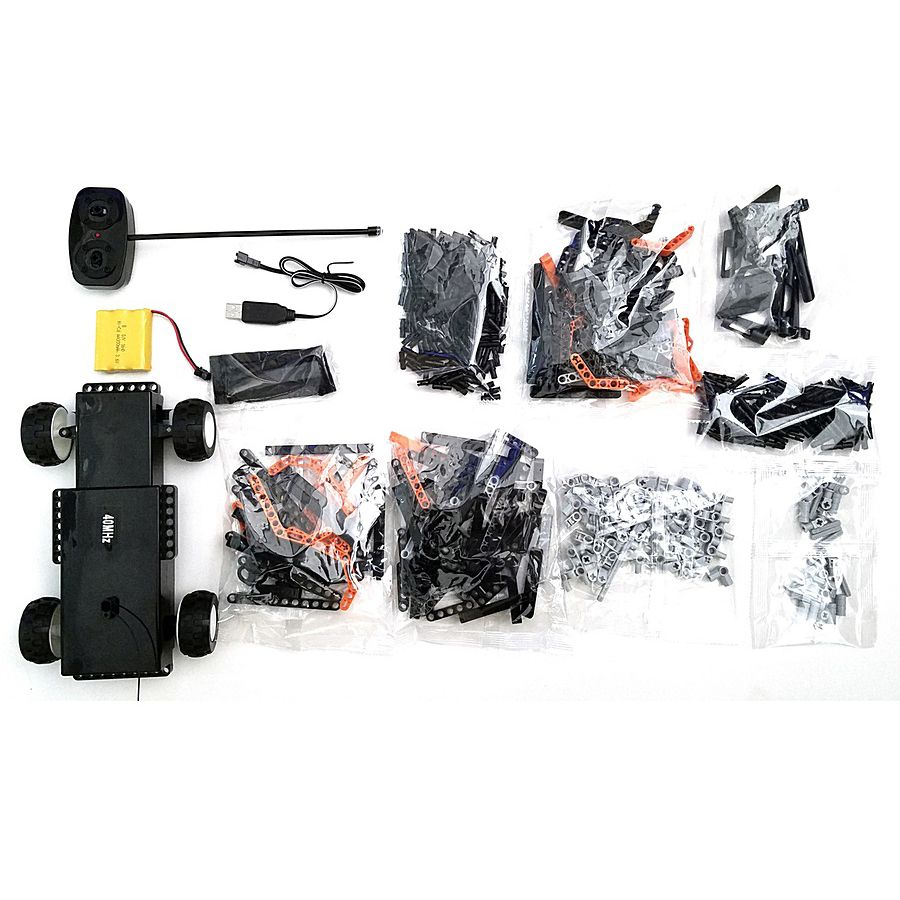 В набор входят элементы для сборки радиоуправляемой машинки и пульт управления. Управляемая пультом, машинка движется вперед, назад, влево и право.