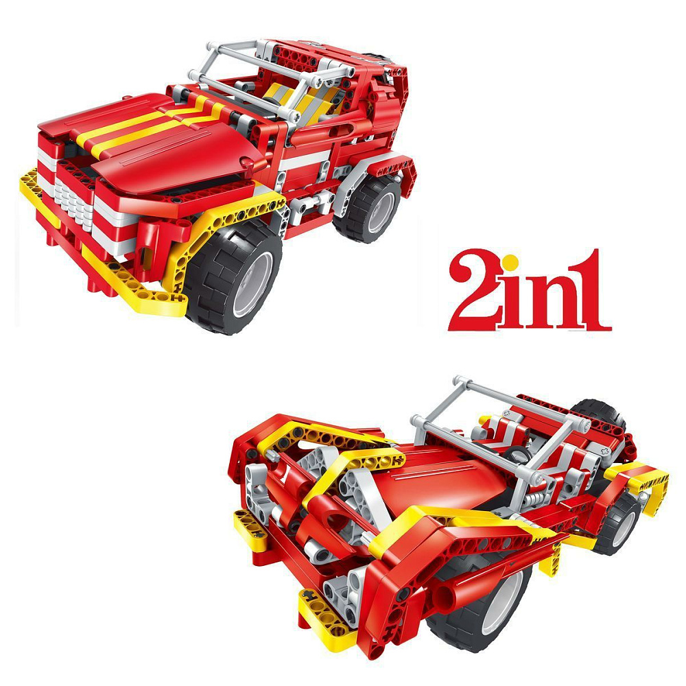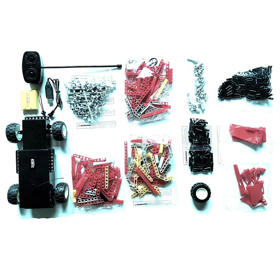 В набор входят элементы для сборки радиоуправляемой машинки и пульт управления. Управляемая пультом, машинка движется вперед, назад, влево и право.