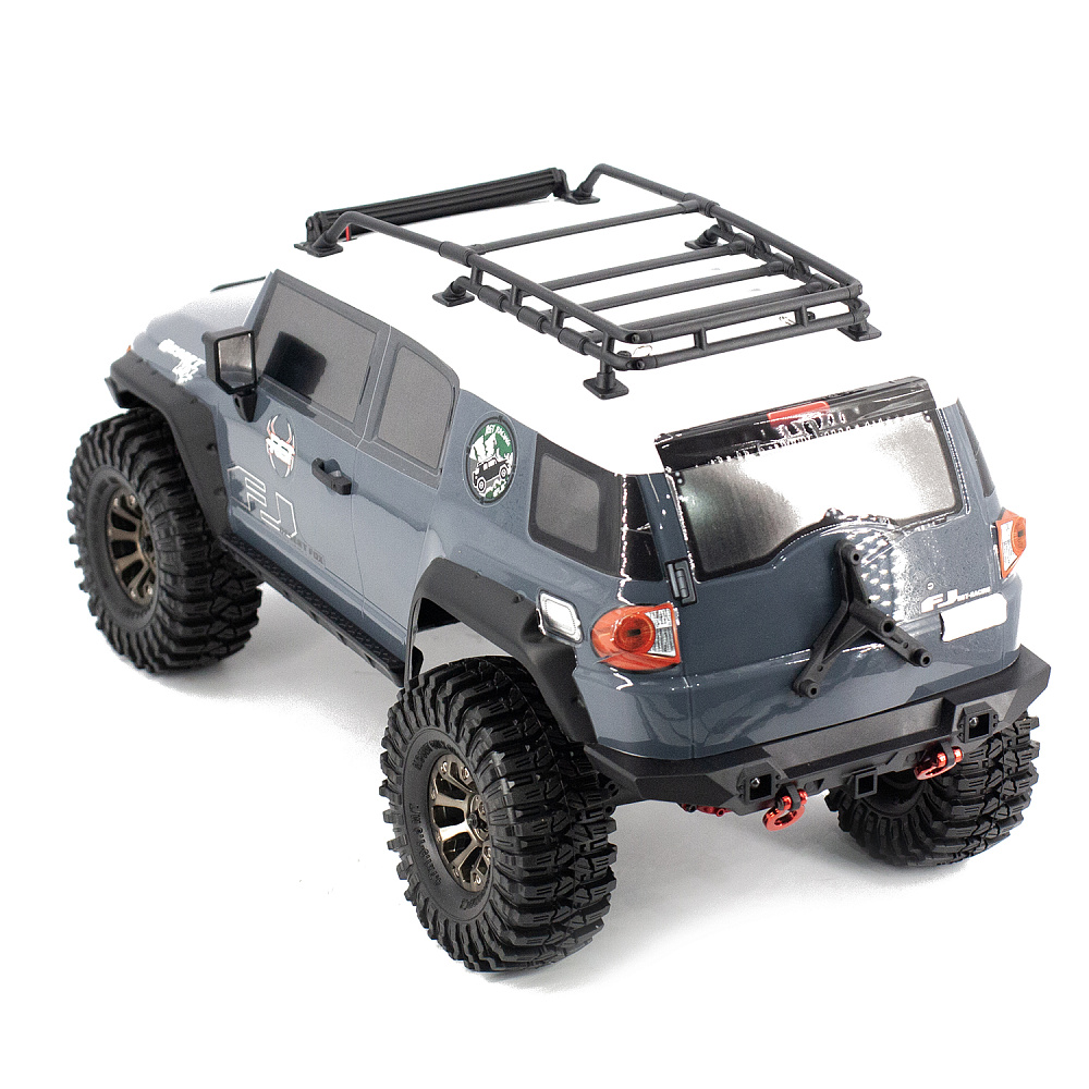 Внедорожник подготовлен для эксплуатации в сложных условиях. Электронный регулятор скорости с влагозащитой, сервопривод рулевого управления с защитой от воды и песка, карданный постоянный полный привод 4WD с дифференциалами из металла, кардан и крестовины из нейлонового композита, защита трансмиссии от попадания песка и камней. Вездеходные колеса с противоскользящим покрытием позволяют внедорожнику подниматься по склонам и преодолевать каменистые поверхности. Управление - пропорциональное. Тяги выполнены из анодированного алюминия, а жесткость рамы достигается применением элементов из металлического сплава.