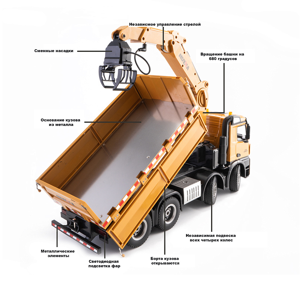 Радиоуправляемый самосвал-кран-погрузчик HuiNa Toys 1:14 - HN1538 - это миниатюрная копия самосвала с вместительным кузовом и краном погрузчиком. Самосвал выполнен очень реалистично и полностью функционирует. Машина обладает высокой проходимостью, благодаря приводу на 4 задние колеса. Такое решение позволяет избежать проскальзывания задних колес. Управлять устройством можно при помощи пульта на частоте 2,4 ГГц, который работает от пальчиковых батареек. Так же с пульта управляется поднятие кузова грузовика. Вы сможете загрузить кузов вручную или при помощи погрузочного крана, перевести на нужное место и выгрузить автоматически. В комплекте сменные насадки для создания сразу трех моделей. Функциональность игрушки не оставит равнодушным даже взрослого. Машина имитирует звуковые сигналы рева мотора, поднимает и опускает кузов, а также оснащена светящимися фарами. Управление происходит на расстоянии 30 метров, а время работы на одном заряде составляет около 30 минут. С этим самосвалом будет интересно играть как взрослому, так и ребенку, ведь вы будете управлять настоящей строительной техникой