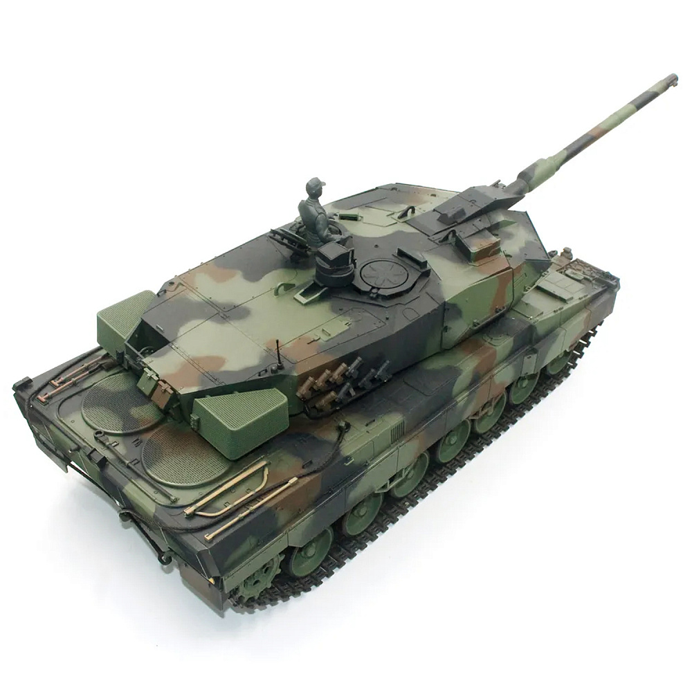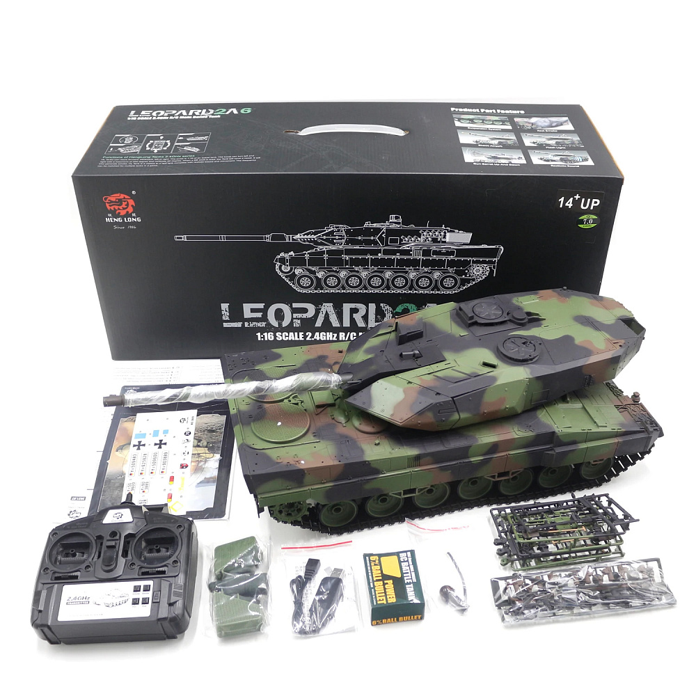 Радиоуправляемый танк Heng Long Leopard 2A6 V7.0 1:16 RTR 2.4GHz - HL-3889-1-V7 - это танк Леопард 2 - немецкий основной боевой танк на радиоуправлении в масштабе 1:16. Развитие Leopard 2 датируется 1970 годом, параллельно с продолжением совместного проекта США и ФРГ MBT-70. Целью был современный и мобильный боевой танк, который должен заменить Leopard 1. По итогам всех испытаний и конструктивных доработок в 1977 году было принято решение о производстве 1800 танков в пяти сериях. В 1979 году он поступил на вооружение. C 2001 года модернизируется до уровня самого современного немецкого ОБТ, уровня Леопард 2А6. Новый танк получил усиленное бронирование башни и дополнительную противоминную защиту. Главным отличием новой модели является орудие Rhl 120/L55 с увеличенной на 11 калибров (1320 мм) длиной ствола.