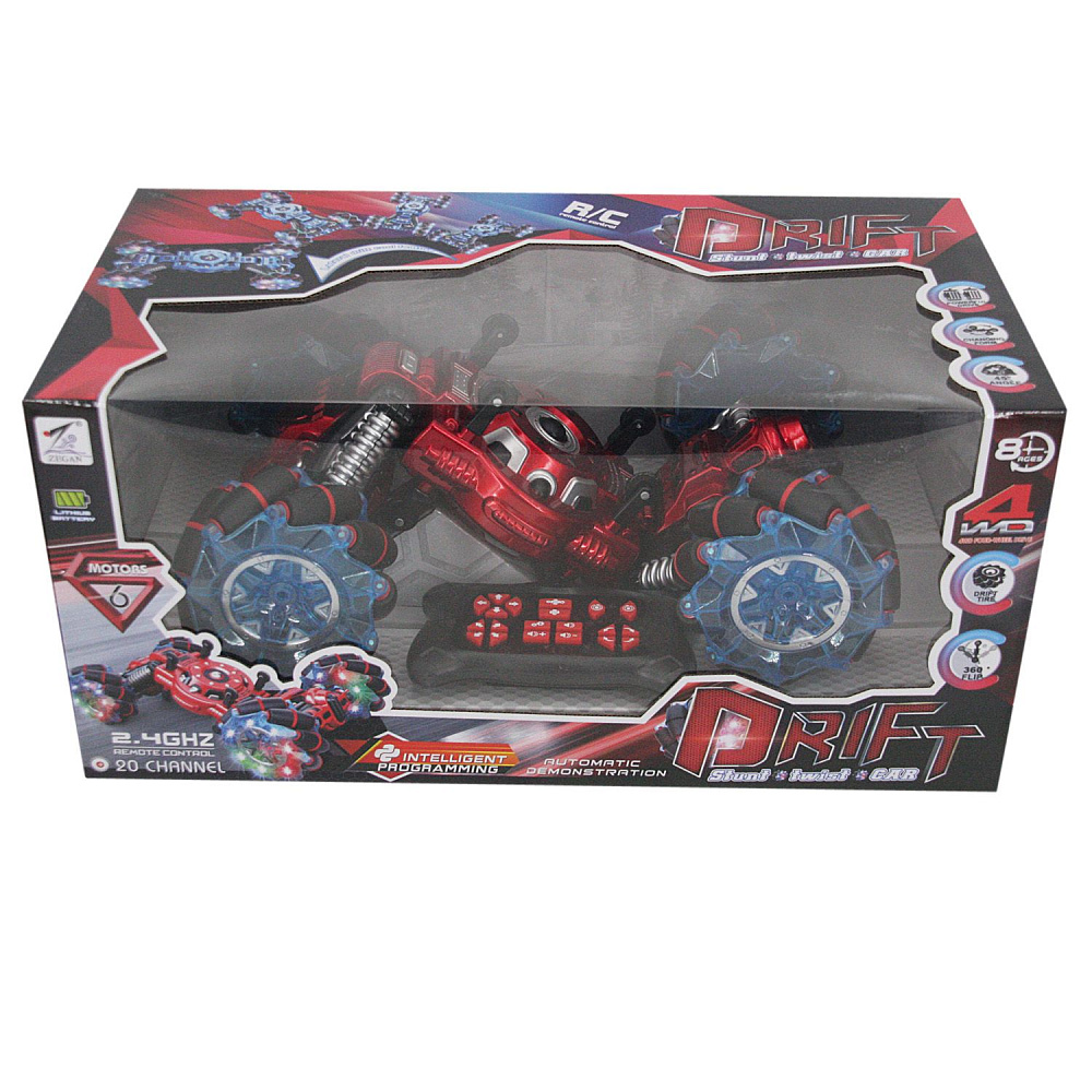 Радиоуправляемый трюковый красный дрифт Твистер Zegan 1:10 - ZG-C1253-RED - это полноприводная машинка перевертыш "ZeGan" c 6-ю ударопрочными моторами и двойной защитой. Большой размер, масштаб 1:10. У машинки есть уникальная возможностью управлять передними и задними колесами независимо друг от друга, поворачивая их вверх и вниз и совершая головокружительные трюки. Машинка двигается во все стороны и даже боком. Она может легко трансформироваться из джипа в гоночную машину и обратно прямо с пульта управления, поднимая шасси для преодоления всех видов препятствий. Необычные световые эффекты колес сделают игру еще более увлекательной. У перевертыша есть музыкальное сопровождение с возможностью регулировки громкости. Мощный Li-ion аккумулятор 1200 mAh, позволяет играть на одном заряде 25-30 минут.