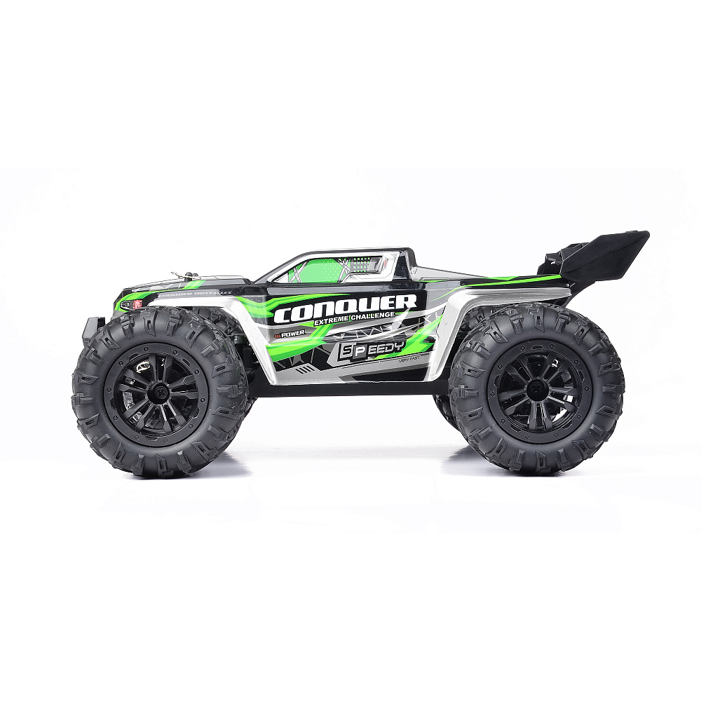 Полный привод повышает проходимость и управляемость модели. На автомодель Conquer установлен коллекторный двигатель 390 класса и влагозащищенный приемник с системой защиты от брызг. Мощный аккумулятор Li-Ion 7.4V 1300 mah, идущий в комплекте, позволяет непрерывно играть до 20 минут! Пульт управления на частоте 2.4Ghz позволит управлять моделью на расстоянии до 80 метров. LED подсветка переднего бампера сделаем игру в темное время суток незабываемой.