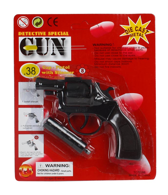 Револьвер металлический с глушителем (58мм) на 8 пистонов, длина 11,5см - TC7228B - это револьвер пистолет на 8 пистонов. Реалистичное оружие обязательно будет любимым в арсенале юного бойца. Револьвер стреляет пистонами, для этого необходимы 8-и зарядные пистоны в форме кольца. При выстреле раздается хлопок и легкий дымовой эффект. Высокое качество. Реалистичное оружие тщательно продумано, оно обеспечит максимальную безопасность детей во время игры.