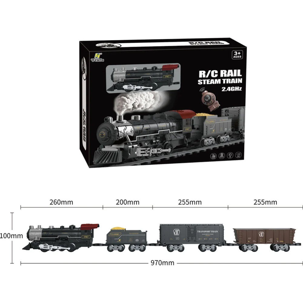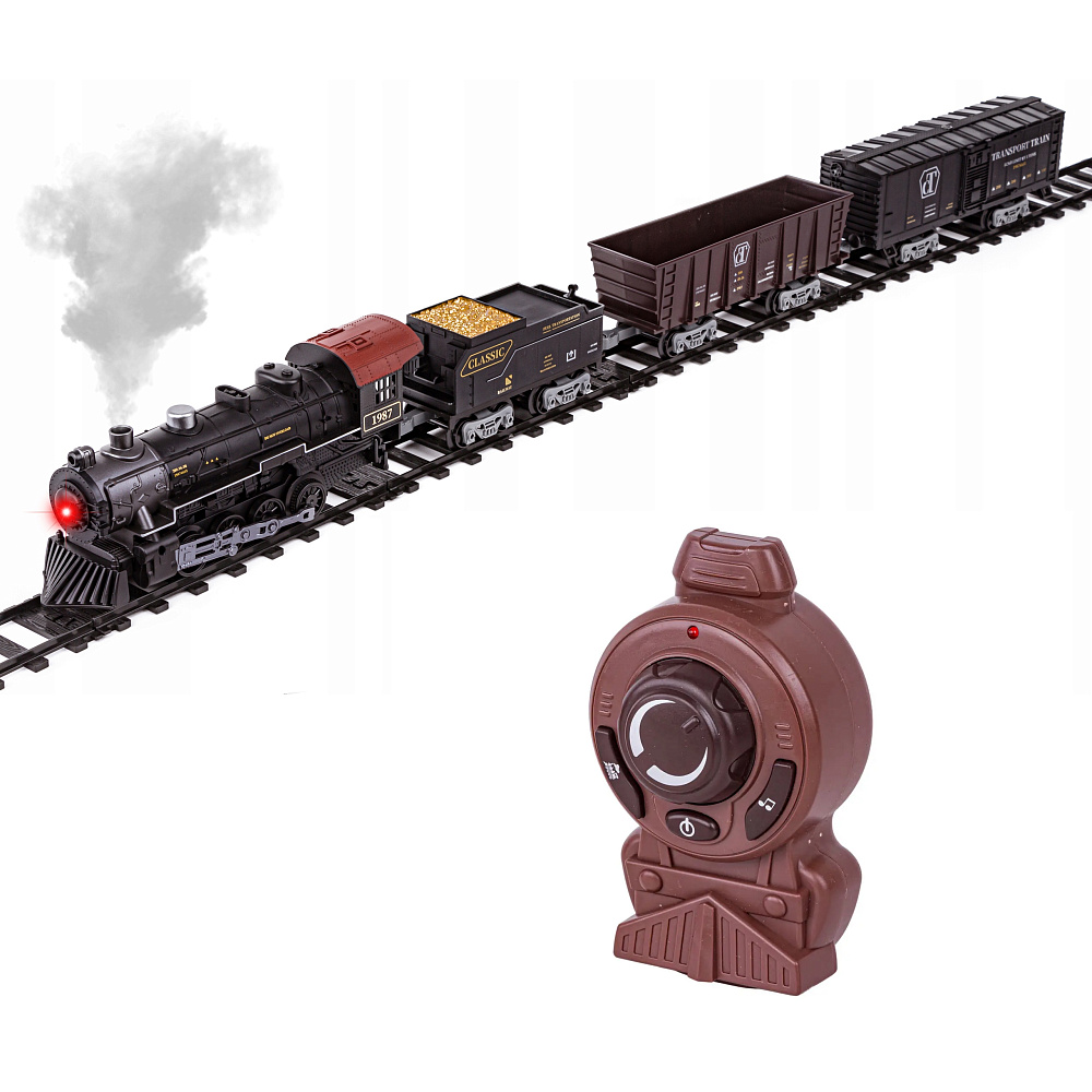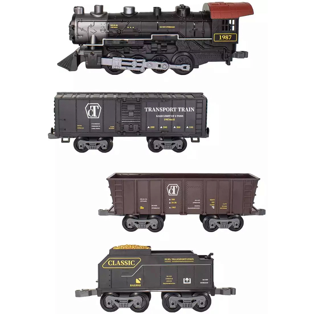 Комплект поставки: локомотив, вагонетка с углем, вагон-рефрижератор, вагон-хоппер, железнодорожное полотно (18 сегментов), железнодорожные знаки, деревья, емкость для воды