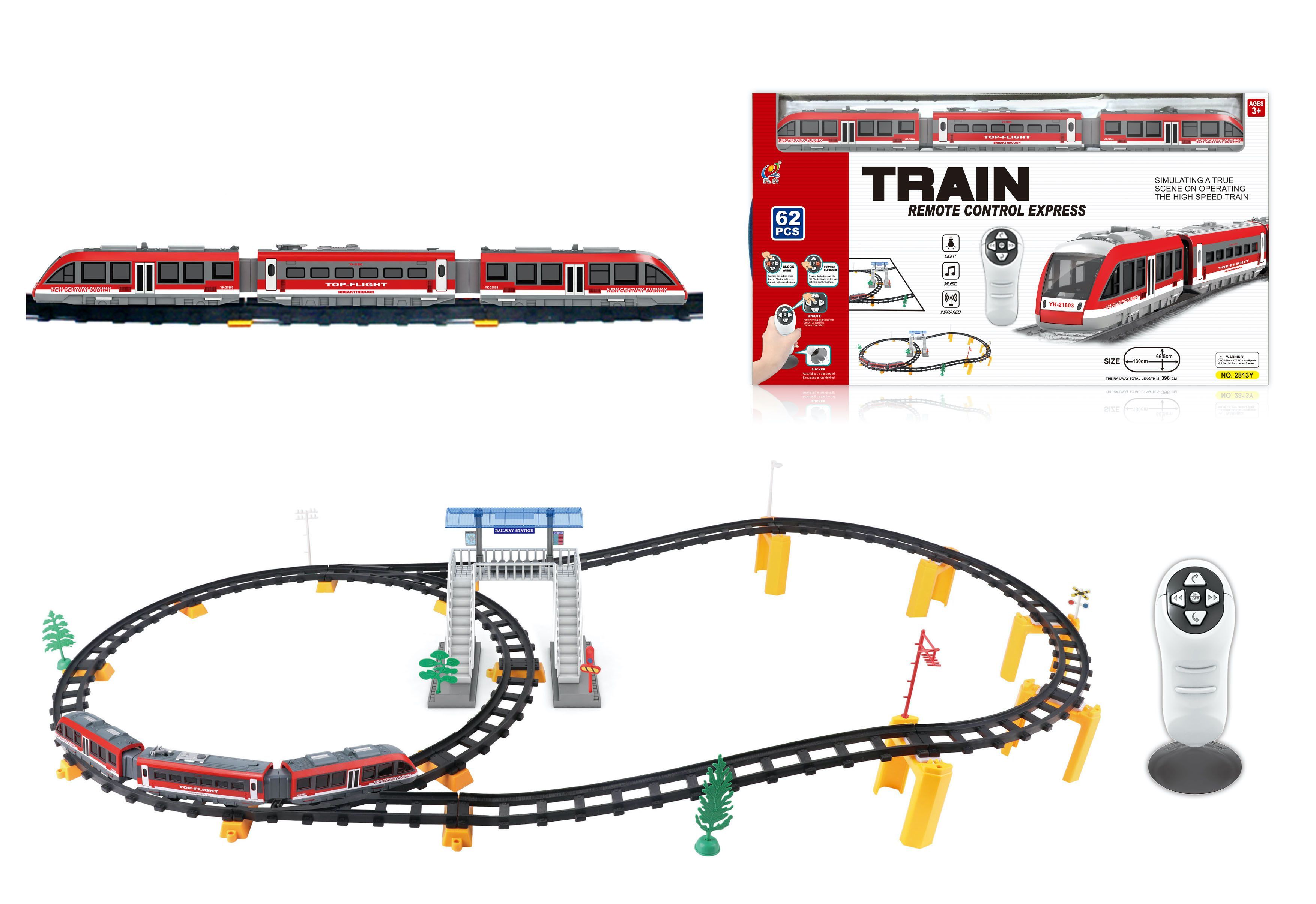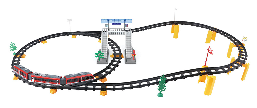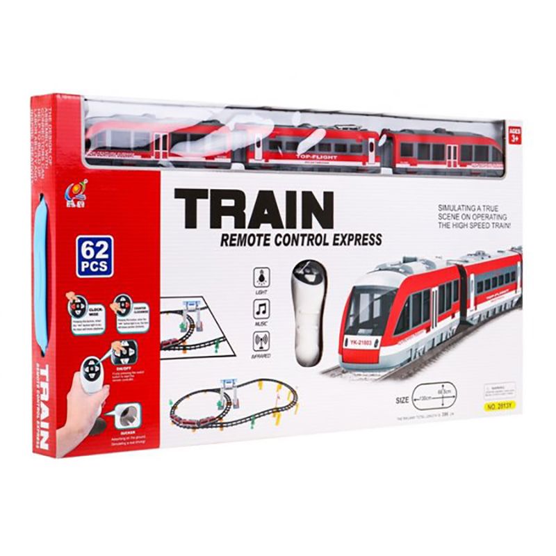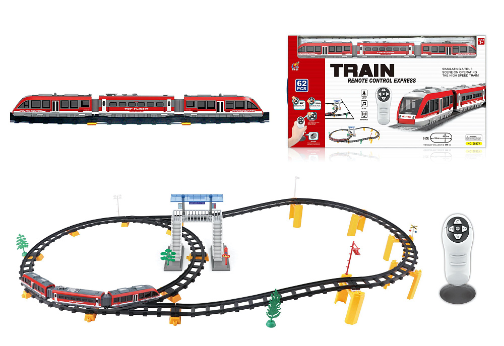 Железная дорога с пультом управления (поезд Красная стрела, длина полотна 396 см, свет, звук) - 2813Y представляет собой целый игрушечный комплекс, способный заинтересовать ребенка возможностью увлекательных реалистичных игр. Однако, перед тем, как приступить к развлечению, необходимо собрать воедино не только детали рельс, но и элементы поезда. Игрушка состоит из трех вагонов и выглядит очень стильно. Ее корпус, окрашенный в красный с серым цвет, отличается тонкой детализированной проработкой. Контролировать движение скоростного супер-экспресса можно с помощью специального пульта управления и вручную. Во время игры можно включать специальные световые и звуковые эффекты, также играют две забавные мелодии.