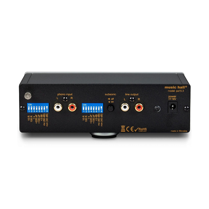 Проигрыватель виниловых дисков Music Hall MMF-9.3 (без картриджа) имеет стол, состоящий из трех платформ, изолированных друг от друга шестью сорботановыми амортизаторами, установлен на трех шиповидных регулируемых опорах. Внешний двухскоростной двигатель 15 В. постоянного тока, с кварцевой стабилизацией скорости вращения. Не резонансный акриловый опорный диск, закрытый керамический опорный подшипник. Тонарм с регулируемой прижимной силой, задемпфированный микролифт, антискейтинг, проводники из сверхчистой меди, позолоченные RCA-разъемы.