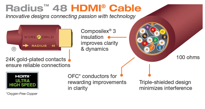 Wireworld Radius-48 HDMI-кабель со скоростью 48 Гбит/с сертифицирован UHS компанией HDMI Group, Llc., что обеспечивает поддержку всех возможностей HDMI2.1, включая 8K / 10K, динамический HDR, VRR, HDCP2.3 и eARC (улучшенный канал возврата звука).