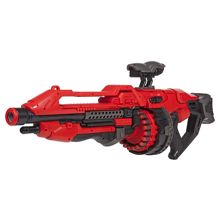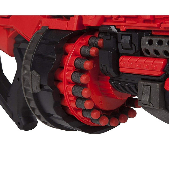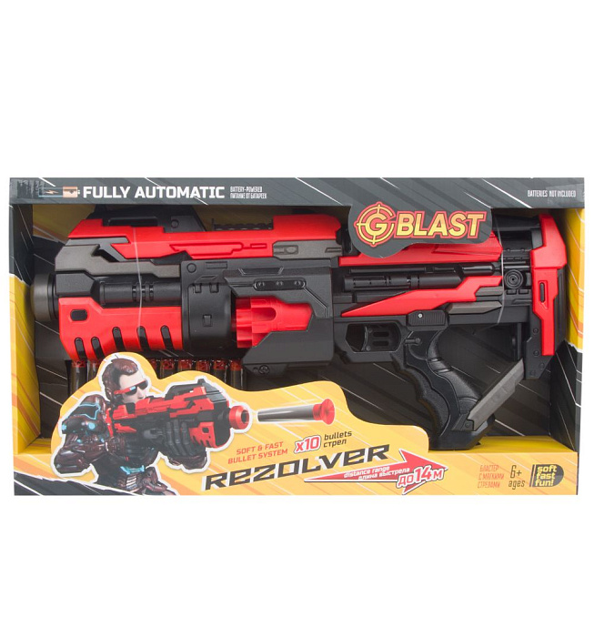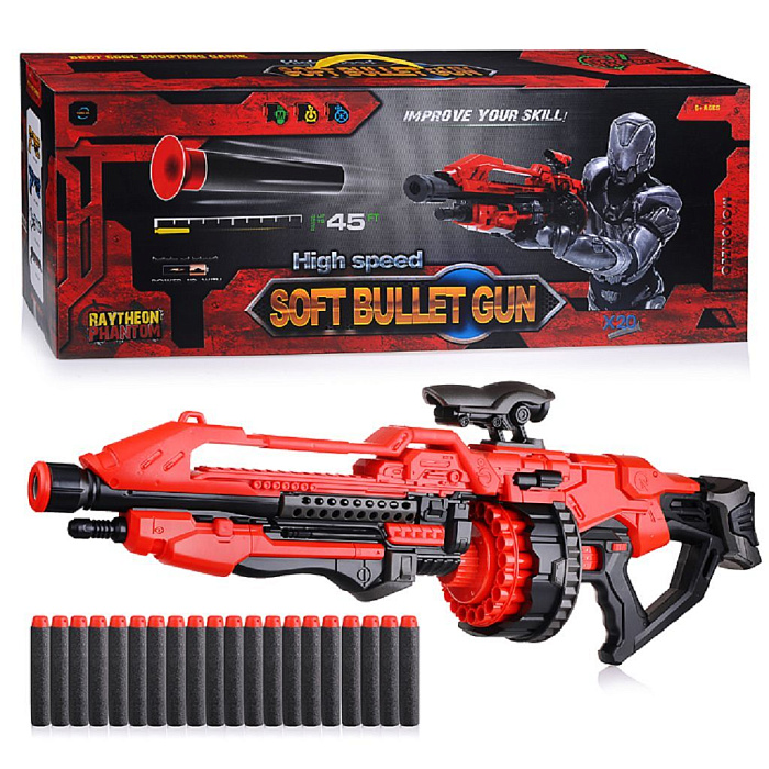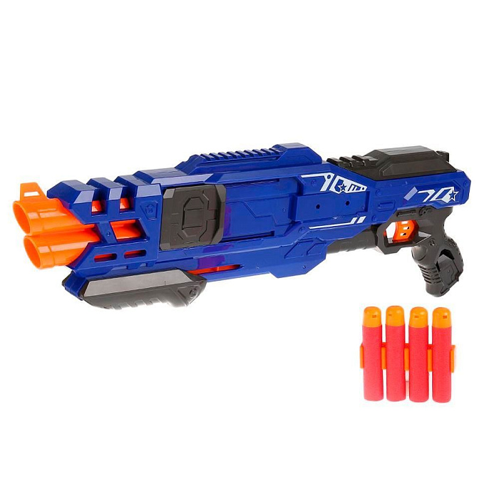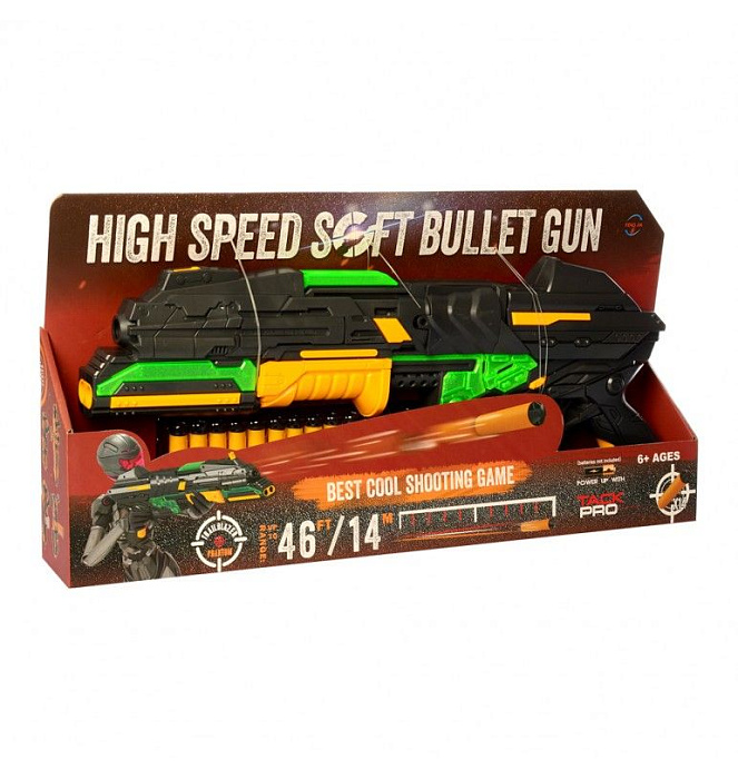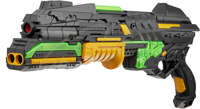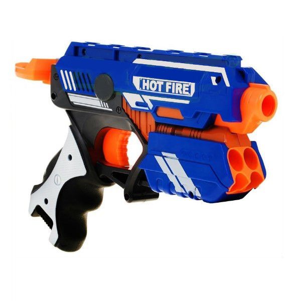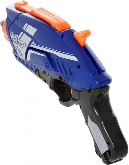 Шестизарядный бластер с мягкими пулями с механическим типом зарядки. В комплекте 20 мягких снарядов.