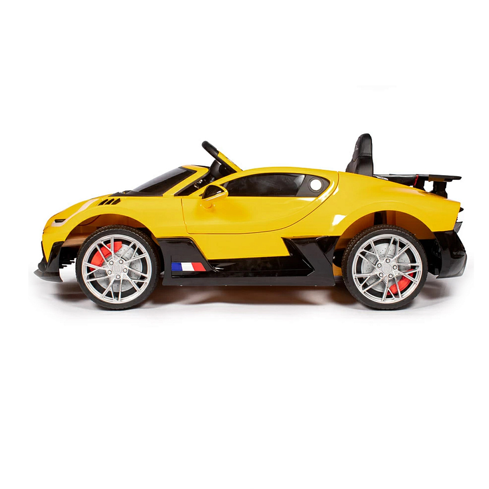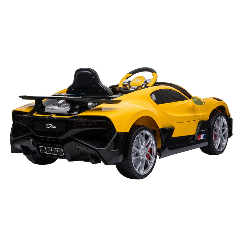 Детский электромобиль Bugatti Divo (желтый лак, 12V) - HL338 - это детский одноместный электромобиль Bugatti Divo по лицензии известного автоконцерна выполнен по стилю легендарной спортивной версии Bugatti. Двухскоростной автомобиль с пультом радиоуправления, у него открываются боковые двери и багажник. Отличие этой модели от других – мягкие резиновые колеса, встроенная магнитола, LEВ подсветка фар и звук мотора, сиденье из перфорированной черной экокожи с логотипом и пульт управления 2.4G.