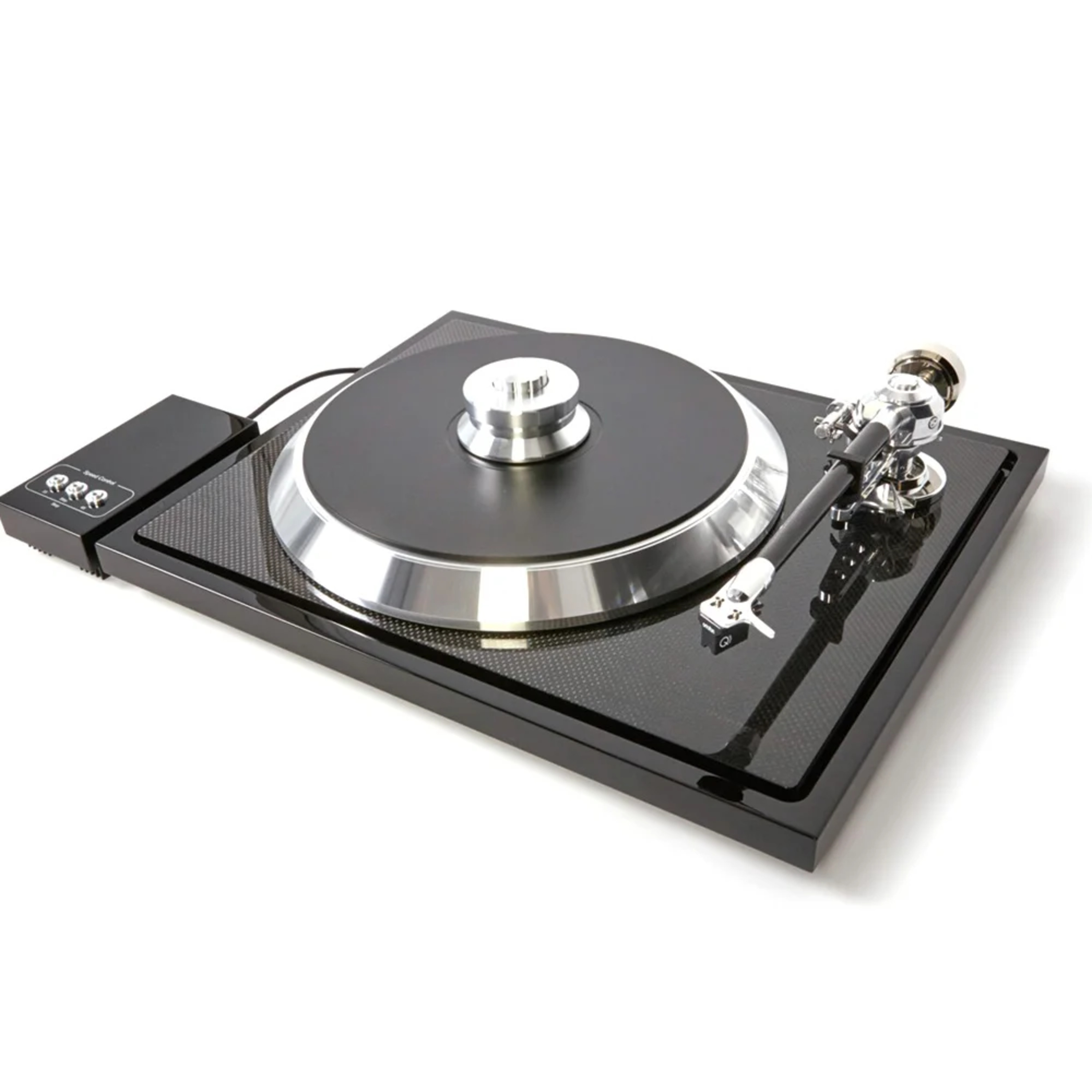 Тонарм представляет собой совершенно новую конструкцию, которая сочетает в себе все преимущества цельноповоротного рычага и карданной конструкции. Цельноповоротный рычаг посередине только снижает нагрузку на подшипник. Традиционный карданный подшипник обеспечивает высокую стабильность и простоту использования при очень низком трении. Кроме того, внутри тонарма находится специальная смазка на основе кремния, которая уменьшает резонансы тонарма и картриджа более чем на 50%