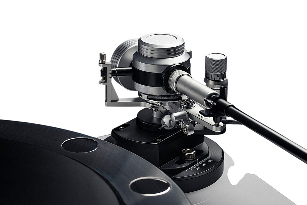 В верхней части подшипника установлен шарик, изготовленный из очень твердой и инертной керамики. В комбинации с тефлоновым основанием в качестве зеркала подшипника эта конструкция обладает хорошими демпфирующими свойствами. Гладкая тефлоновая поверхность обеспечивает исключительно плавное вращение без рокота. Опорный диск использует подвес из неодимовых магнитов. При этом маленькие магниты не оказывают влияния на звукосниматель, поскольку находятся далеко от него. Благодаря магнитному подвесу мы можем вращать диск очень большой массы, практически не создавая нагрузки на подшипник. При этом вращение не сопровождается рокотом. (Утяжеленный диск, как правило, создает высокий уровень рокота). Нагрузку на подшипник можно регулировать. Разные подходы позволяют по-разному справиться с этой задачей. На проигрывателях Forte она регулируется на слух согласно вашим индивидуальным предпочтениям.
