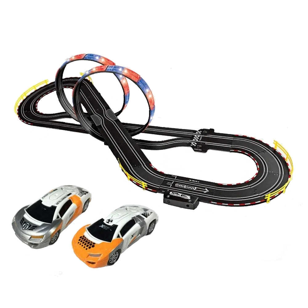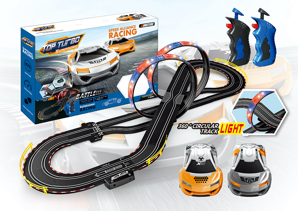 Гоночный автотрек Soba (540 см, 2 машинки на пульте, питание от сети, свет) - SOBA-A47-17 - это игрушечная трасса, которая работает от сети. Автотрек поможет мальчикам устроить соревнования на скорость. Прежде чем начать игру, ребенку предлагается из входящих в комплект деталей собрать трассу со сложной конфигурацией. Трек длиной 5,4 метра подойдет для долгих заездов. Он содержит разделительные полосы и имеет крутые виражи. Машинки из набора выполнены в масштабе 1:43 по отношению к настоящему транспорту. Дети смогут управлять игрушечными спорткарами посредством пультов дистанционного управления. Под управлением детей машины способны перемещаться в различных направлениях. Во время движения у детских автомобилей загораются фары, что придает игре реалистичности и динамичности. Играя с автотреком, мальчики смогут улучшить координацию в пространстве, развить внимательность, сосредоточенность и воображение.