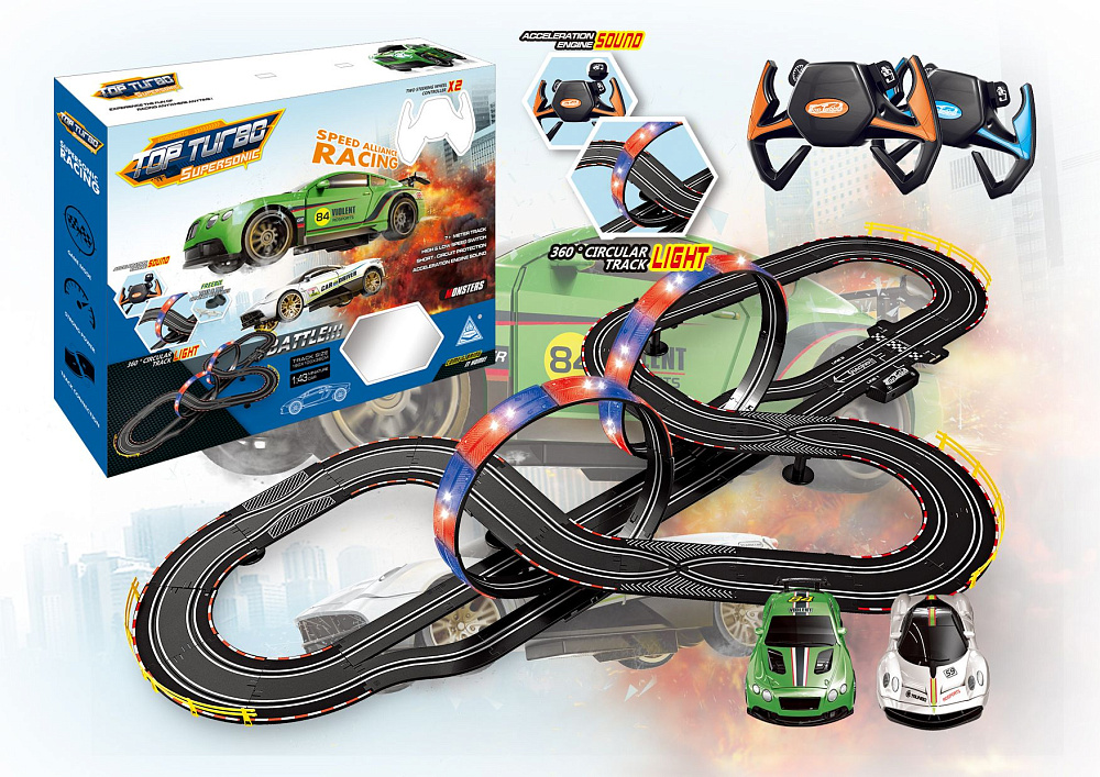 Гоночный автотрек Soba (760 см, 2 машинки на пульте, питание от сети, звук, свет) - SOBA-A47-18 - это гоночная трасса длиной 7.6 метров от компании SOBA. Теперь играть стало еще веселее, а гонки станут главной игрой для юных ребят. Особенность данной модели в том, что только вы задаете скорость движения машинки. Управление - в форме руля. Левая кнопка служит для управления скоростью машинки, правая для звукового сигнала. На поворотах нужно притормаживать, чтобы не вылететь за пределы трассы. Когда машинка приближается к петле - нужно максимально ускориться - чтобы успешно преодолеть этот участок трассы., В общем, все как в настоящих гонках.