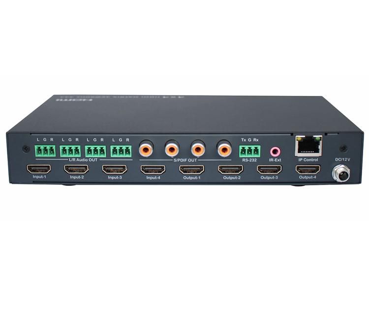 Dr.HD MA 447 FX – более продвинутый аналог модели Dr.HD MA 446 FX – позволяет подключать 4 любых видео источника на 4 экрана. Стандарт HDMI 2.0 – видео разрешения до 4K @60 Гц YUV 4:4:4 8-разрядный, HDR (при 4K @60 Гц YUV 4:2:0 10-разрядный), HDMI 2.0 a, HDCP 2.2, 18 Гбит/с. Поддерживает извлечение звука через S/PDIF для каждого выхода HDMI, чтобы использовать преимущества акустических систем вместо встроенных динамиков на дисплеях.