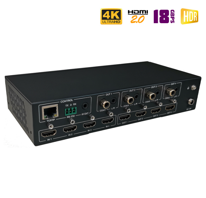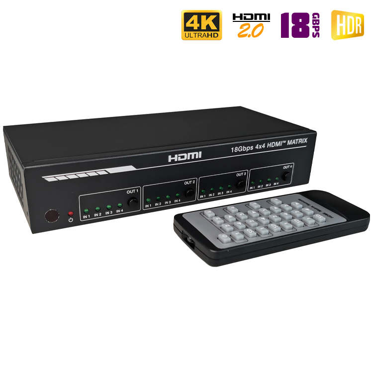 Превосходная матрица от известного бренда с 2х годичной гарантией. Она прекрасно подойдет для коммутации нескольких источников с HDMI выходами и выводом изображения на 4 экрана (телевизора, монитора или проектора) в любой конфигурации. Каждый вход и выход поддерживает разрешение до 4K 60Hz 444 и HDCP 2.2, а выходы могут быть индивидуально масштабированы 4K→1080p.