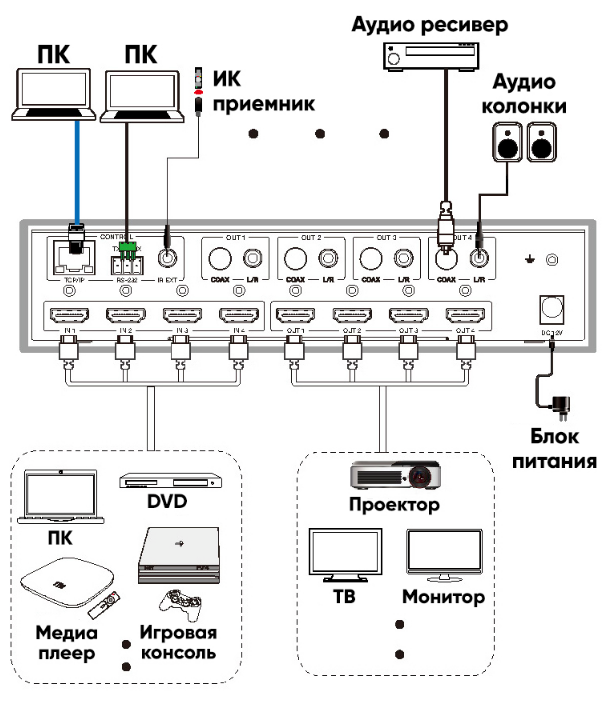 Матрицу Dr.HD MA 447 SLA можно использовать как дома, так и в офиса, магазинах, барах/ресторанах, учебных заведениях и других объектах, где стоит задача объединить несколько источников и несколько экранов
