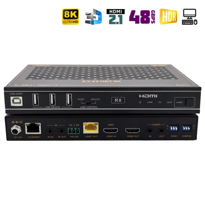 HDMI удлинитель по витой Dr.HD EX 90 HBT 8K предназначен для передачи несжатого видео- и аудио- сигнала ультра высокой четкости (Ultra HD), управления по RS-232 и ИК, а также 1GbE Ethernet, на расстояние до 90 м по одному кабелю витая пара CAT 6A/7. Разрешение видео до 8K 30 4:4:4 10bit, 4K 120Hz 4:4:4 10bit. Поддерживается передача eARC/ARC с HDMI-выхода RX на HDMI-вход TX или деэмбеддинг звука на выходной порт HDMI TX. Кроме того, он поддерживает передачу сигнала USB 2.0 (Host/Device настраивается) и двунаправленную функцию POC.