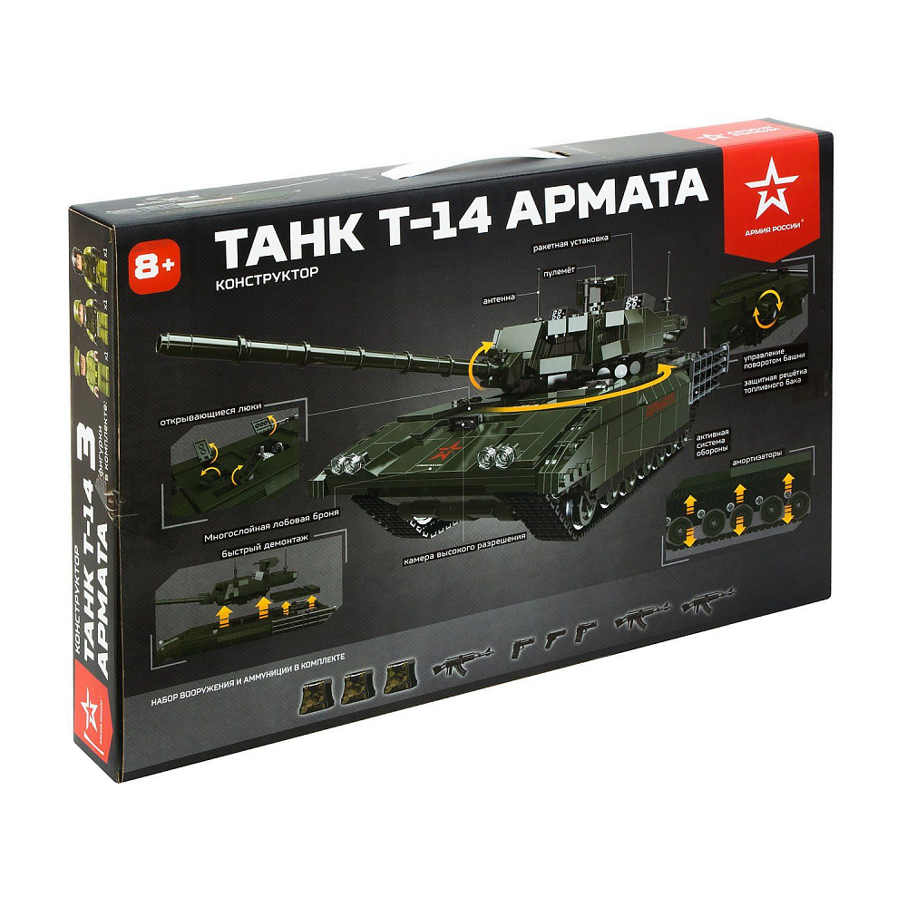 Конструктор ''Танк Т-14 ''АРМАТА'' - АР-01009 - это набор, в состав которого входят 1612 прочных безопасных пластиковых деталей для сборки копии модели Танка Т-14 на платформе АРМАТА, стоящего на вооружении Российской Армии.