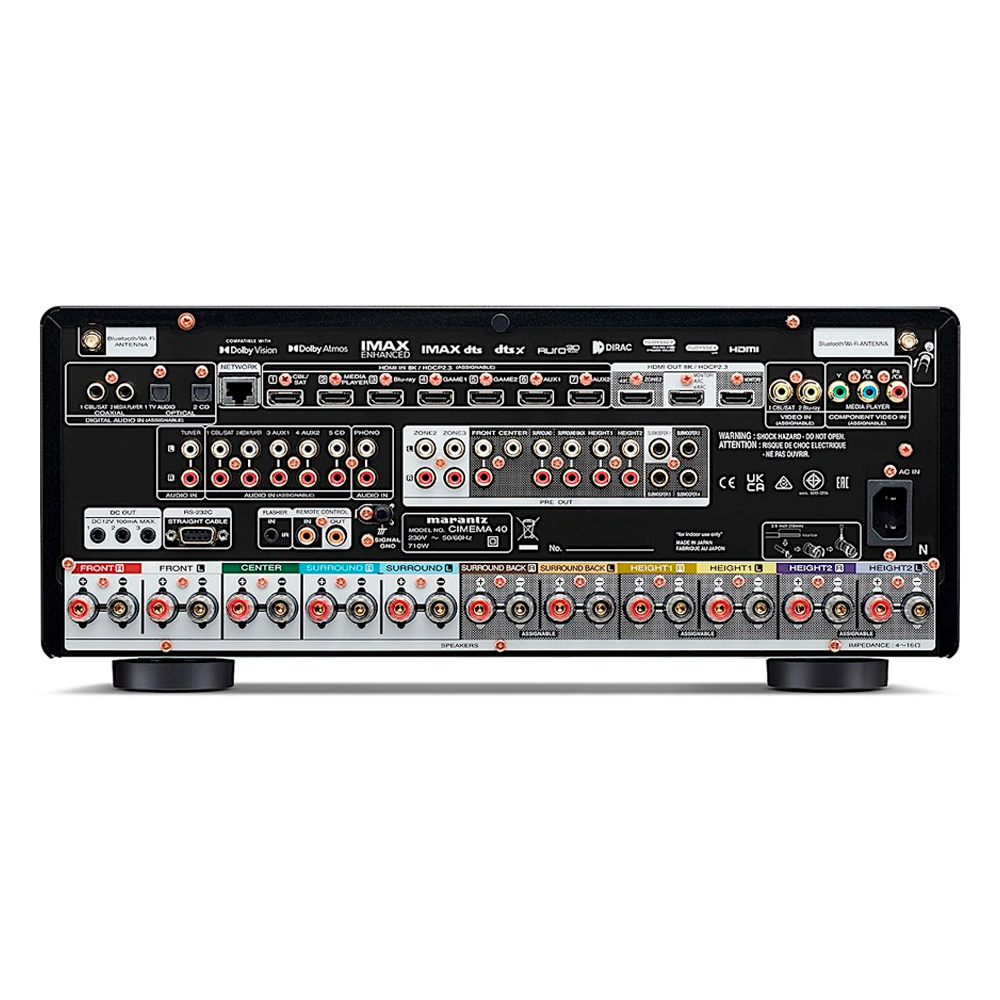 Marantz Cinema 40 включает в себя семь входов HDMI и три выхода для всех ваших любимых источников. Все входы поддерживают пропускную способность 8K/60 Гц или 4K/120 Гц, субдискретизацию Pure Color 4:4:4, сквозную передачу Dolby Vision, HLG, HDR10 и BT.2020, а также HDCP 2.3, новейшую защиту от копирования. стандартов, поддерживаются на всех входах HDMI. Демонстрируя новейшие технологии и технические характеристики HDMI, Cinema 40 позволяет вывести домашние развлечения на новый уровень благодаря поддержке HDR10+, Dynamic HDR, ALLM, VRR и QFT. Видеопроцессор также способен масштабировать исходное видео до качества 8K.